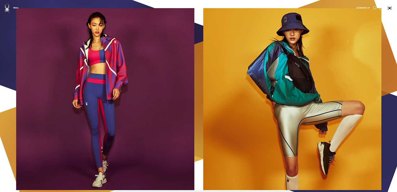 미국 스포츠 의류 브랜드인 스파이더는 나이키와는 또 다른 매력이 있는 홈페이지를 가지고 있다. 홈 화면은 레이아웃이 좀 비슷하긴 한데 상품 상세페이지는 확실히 구별된다. 어둡게 블러 처리된 사이드바도 확실히 트렌디해 보인다.