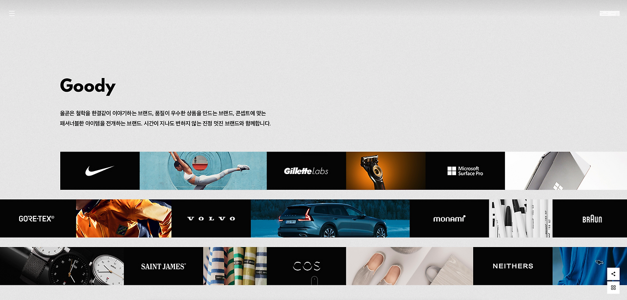 상품 상세페이지는 약간 나이키 공식 홈페이지가 떠오르긴 하지만 젠틀 몬스터 홈페이지의 진가는 스토리 페이지에 있다. 각 스토리마다 특색 있게 디자인된 페이지는 디자이너에게 좋은 영감을 주기 적합하다.