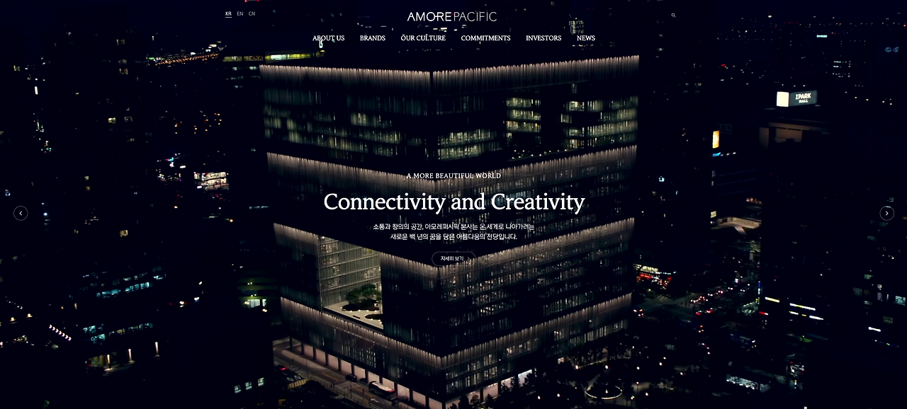 아모레퍼시픽은 역사도 꽤 깊고 운영하고 있는 브랜드도 40개가 넘는다. 이에 따라 수많은 정보들(각 브랜드마다의 설명, 기업가치, 기업문화, 주가정보 등등...)을 보기 좋게 정리하는 것이 중요했을 것이다. 아모레퍼시픽의 기업 홈페이지는 그런 점을 잘 해결한 예시라고 볼 수 있다. 많은 컨텐츠들을 군더더기 없이 잘 정리한 사이트가 필요하다면 참고하길 추천한다.