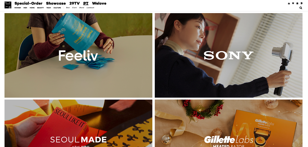 29CM의 쇼핑화면은 많이들 봤을 테니까 PT페이지를 소개하고 싶다. 여기서 PT는 Personal Training을 말하는 게 아니고 PresenTation을 의미한다. 말 그대로 브랜드가 지닌 가치와 정보를 온라인상에서 '프레젠테이션' 하는 페이지라고 생각하면 된다. 29CM의 PT페이지는 한 권의 잡지를 보는 듯하다. 한 브랜드를 선정해 브랜드의 히스토리와 철학을 설명하고 또 그 정보를 바탕으로 스토리텔링을 하기 때문에 몰입도가 상당하다.