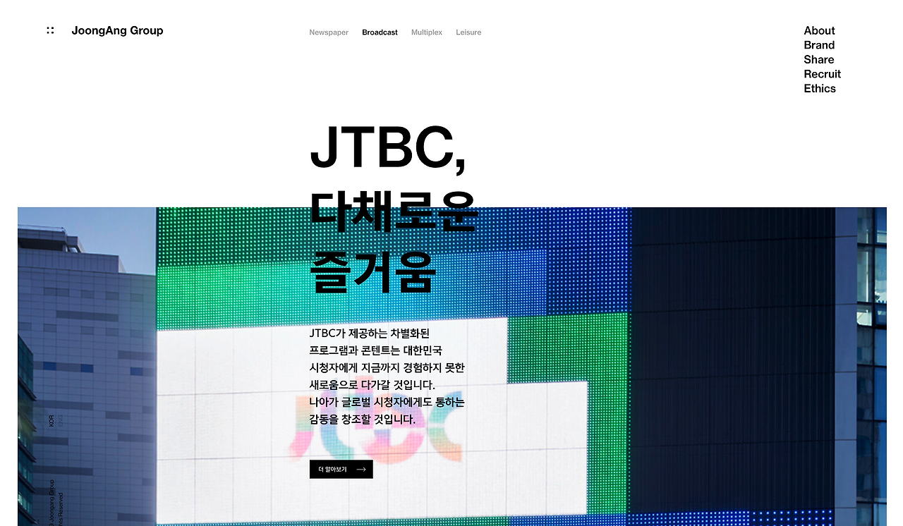 중앙그룹은 중앙일보, JTBC, 메가박스 등 이름만 대면 알법한 계열사들을 가지고 있는 그룹이다. 뭔가 그룹 이름을 들었을 때 고리타분한 홈페이지일 것 같지만 전혀 그렇지 않다. 각 컨텐츠마다의 몰입도도 좋고 레이아웃도 꽤 도전적이다. 컨텐츠를 다루는 그룹답게 사이트의 내용 전개도 훌륭한 것 같다.