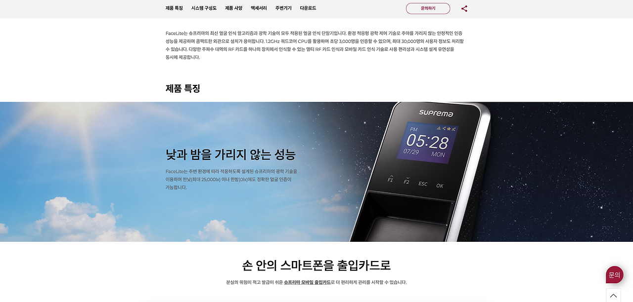 바이오인식 기술을 통해 다양한 제품과 솔루션을 제공하는 기업이다. 근태관리, 지문인식기 등으로 유명한데 최근에는 코로나 시국에 발맞춰 비접촉 발열감지기도 내놓은 것 같다. 이 사이트의 특징은 전문적이고 복합적인 기능을 가진 제품을 웹에서 잘 설명해주고 있다는 것이다. 애플같이 다양한 CSS기능을 통해서 보여준 건 아니지만 참고할 부분이 있는 것은 확실하다.