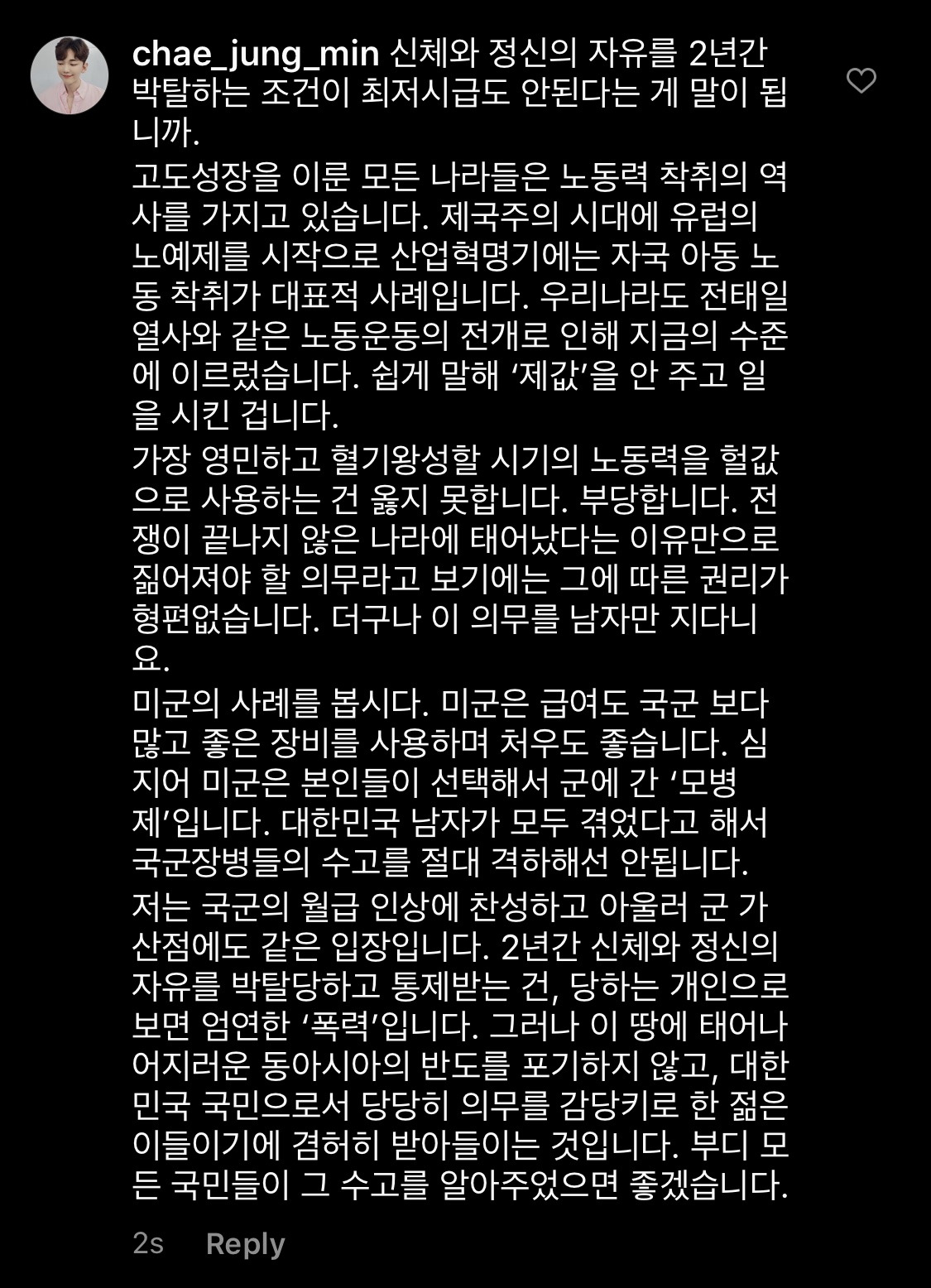 가장 영민하고 혈기왕성할 시기의 노동력을 헐값으로 사용하는 건 옳지 못합니다. 부당합니다. 전쟁이 끝나지 않은 나라에 태어났다는 이유만으로 짊어져야 할 의무라고 보기에는 그에 따른 권리가 형편없습니다. 더구나 이 의무를 남자만 지다니요.