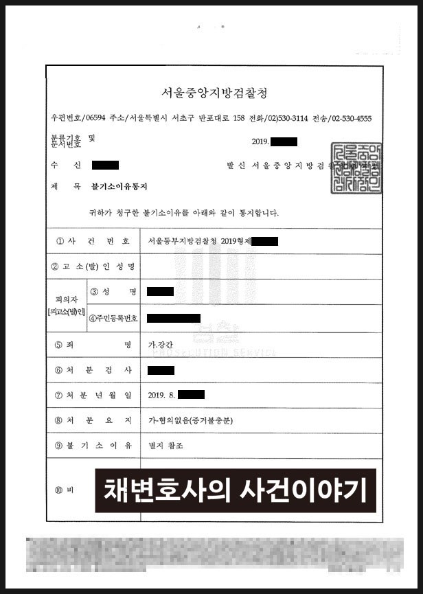 결국 X의 진술 외에 A의 강간 혐의를 입증할 객관적인 증거가 없다는 이유로 주임검사는 A에게 무혐의, 다시 말해 불기소(혐의없음) 처분을 하였습니다.