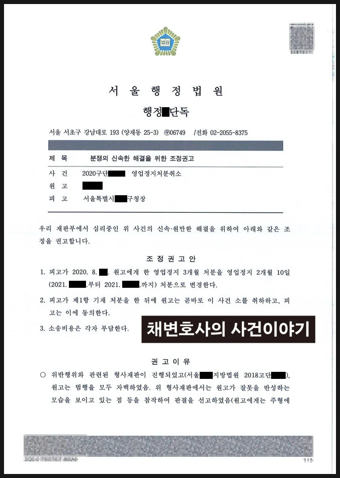 그러나 재판부는 3개월 영업정지 처분을 2개월 10일로 줄이고, 당장 영업정지 처분을 당하는 것이 어려운 A의 사정을 고려하여, A가 원하는 날짜에 영업정지처분을 내리는 것으로 조정권고를 하였습니다.