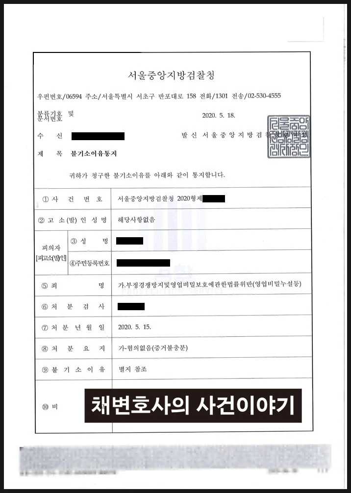 검사는 "A가 X회사의 업무상 자산이 되는 파일 등을 외장하드 내지 컴퓨터 하드디스크에 저장한 다음 퇴사하면서 무단으로 반출하거나 반환·폐기하지 아니한 사실은 인정된다"면서, "A는 해당 파일자료가 '영업비밀'에 해당하지 않는다고 주장하고 있는데, X가 소규모 회사라는 점이나 완화된 법상의 비밀관리성 구성요건을 고려하더라도, 이 사건 파일자료가 X에 의하여 합리적인 노력으로 비밀로서 유지·관리되었다고 단정짓기 어렵고, 달리 피의사실을 인정할 증거가 없다"며 변호인의 의견을 받아들여 혐의없음(증거불충분) 처분을 내렸습니다.