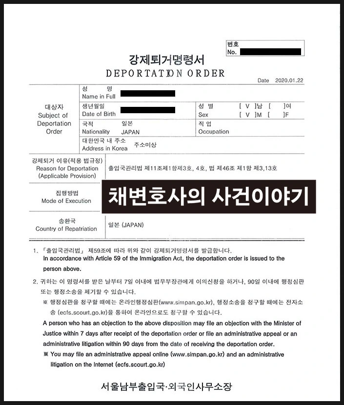 일본인 의뢰인은 집행유예 형을 확정받은 후 출입국관리법에 따라 강제퇴거명령을 받았습니다.