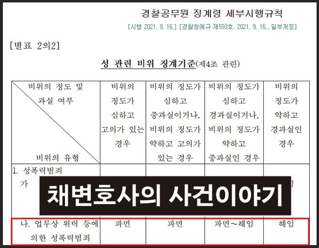 경찰공무원 징계령 시행규칙 [별표1] 징계기준에 따른 7. 품위 유지 의무 위반(성폭력) 비위로서, 비위의 정도를 가장 약하게 보더라도 그 하한이 해임인 점, 성 관련 비위는 공무원 3대 비위 중 하나로 공직 사회에서 반드시 척결해야 할 대상으로 규정하여 징계양정 기준을 강화하는 등 이에 대해 엄벌하고 있는 추세인 점 등을 고려할 때 원처분 상당의 책임이 인정되는 바이다.