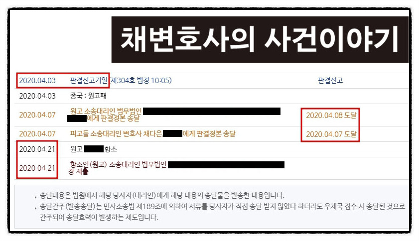 만약 상대방이 항소하는지 여부를 보고 의뢰인의 항소여부를 따지고자 한다면 발송된 판결문 파일을 늦게 클릭해서 늦게 송달받는 방법을 취한답니다. 이 사건의 경우는 일방이 전부승소한 건이므로 그런 계산은 불필요했겠죠!