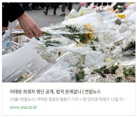 (서울=연합뉴스) 박재현 정성조 황윤기 기자 = 한 인터넷 매체가 13일 이태원 참사 희생자 155명의 이름을 공개하면서 법적 논란으로까지 번지...