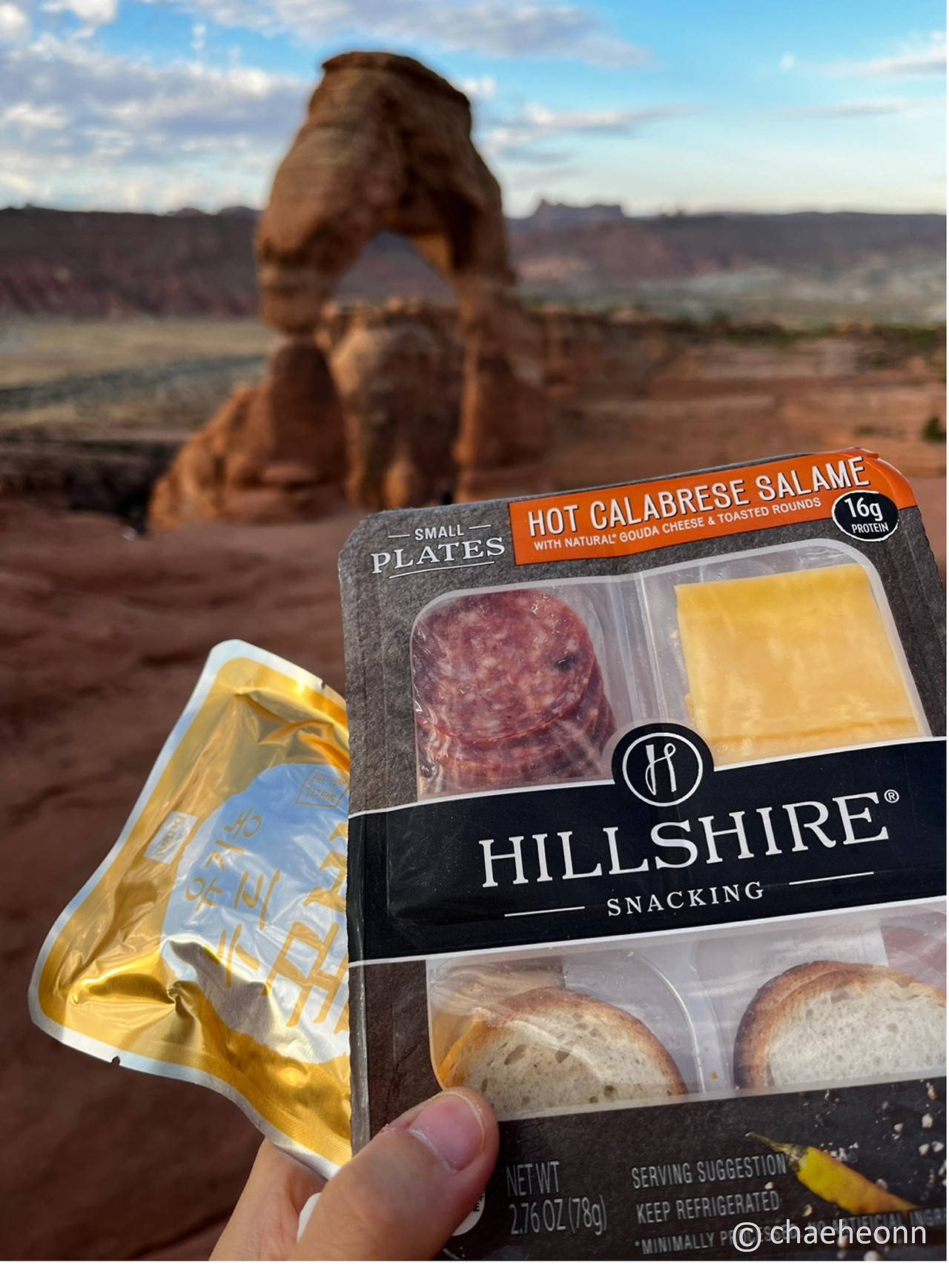 아치와 사진을 찍고는 아치를 바라보고 앉아 간식을 먹었다. 거대한 아치와 아치를 보고 신나하는 사람들을 보며 맛밤과 솔뫼가 이건 꼭 사야 한다고 했던(그런 게 많긴 했지만) 바게트 조각과 살라미, 치즈가 함께 담긴 런치팩을 먹었다. 런치팩의 비주얼이 지극히 단순했기 때문에, 그냥 바게트 자른 거, 그냥 살라미, 그냥 치즈겠지, 전혀 기대하지 않았다.