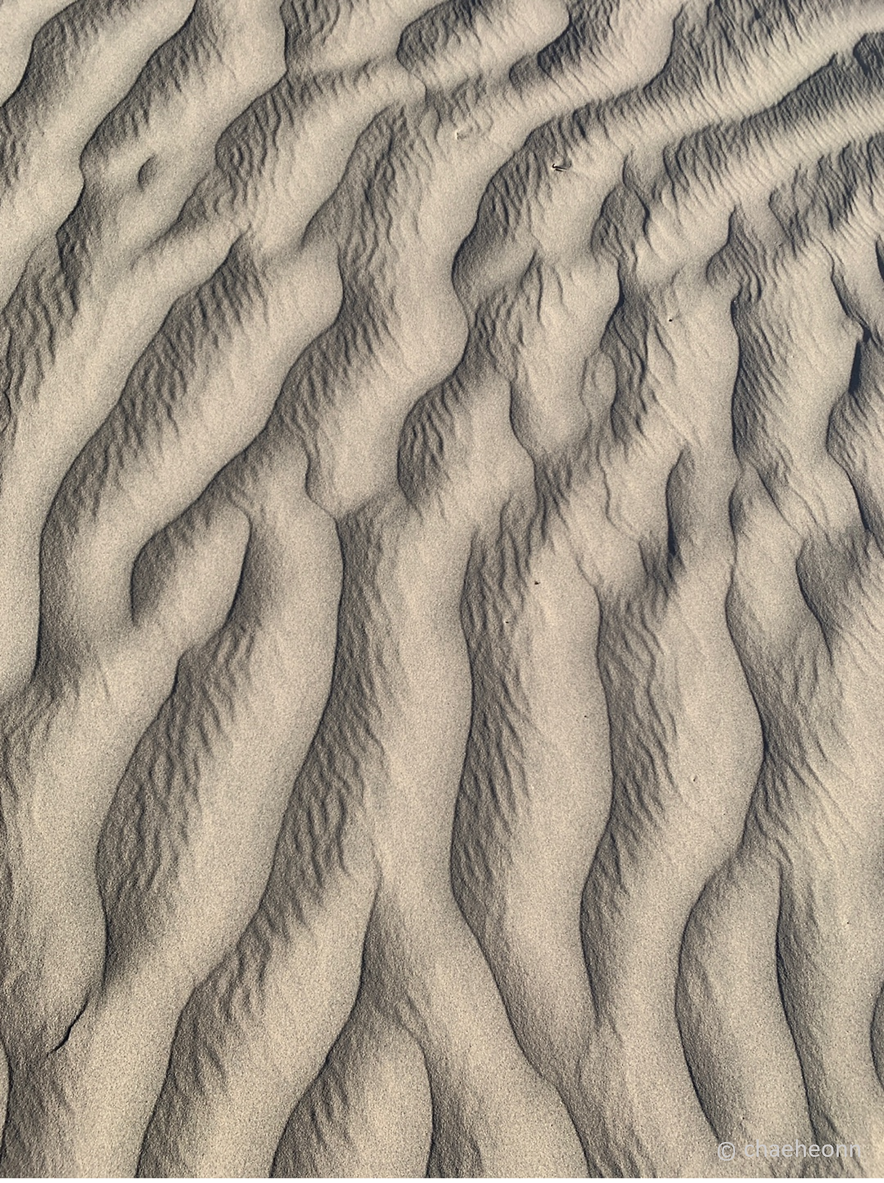 하지만 모래 언덕을 보는 순간 식곤증도, 피곤한 기운도 싹 달아났다. 그도 그럴 것이 황무지 평원을 달리다 어느 지점에서 갑자기 모래 언덕이 뚜둔, 하고 등장한다. 와, 이게 뭐야! 차를 세우고 후다닥 달려 올라가니 온통, 전부, 눈에 보이는 게 다 모래다. 사막이니까 지극히 당연……한 것이겠지만 당연한 걸 처음 보는 나로선 입이 딱 벌어졌다. 방금 전까진 아무것도 없이 황량한 허허벌판이었거든. 그런데 써든리, 언익스펙티들리, 내 눈 앞에 키 세네 배쯤은 되는 모래 언덕이 나타난 거야. 얼마나 신기하겠냐고. 이세계異世界로 떨어지면 이런 기분이려나. 나는 홀린 듯 모래 언덕을 둘러보았다.
