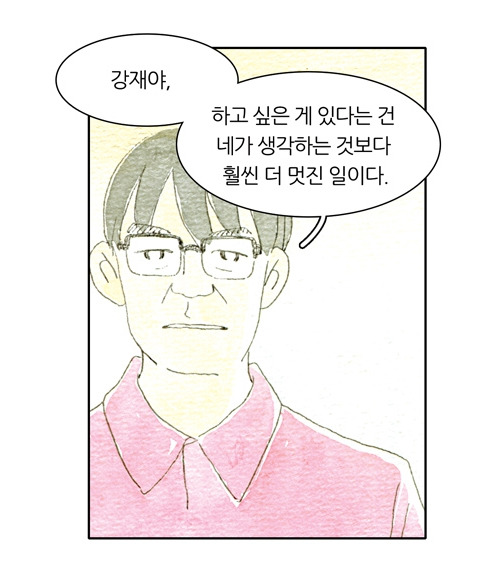 미국 유학 간 친구 이야기가 나온다. 그는 미국 유학 초반엔 외모와 옷에 신경 썼지만 그들은 그런 걸 전혀 신경 쓰지 않았다. 그들은 단지 그의 생각에 관심 있었다. 이 친구는 우연치 않은 계기로 미국에 갔다. 그전까진 그냥 전형적인 한국 학생처럼 입시를 위해서만 살았다. 그러다 의도치 않게 멈춰야 할 일이 생겼고 쉴 겸 가본 것이다. 그리고 미국에 한 번 가서 자신이 좋아하는 일을 찾았다. 아버지의 지지로 미국 유학을 결정한다(소개한 내용이 스포일러일까 고민했지만 아니라고 판단했다).