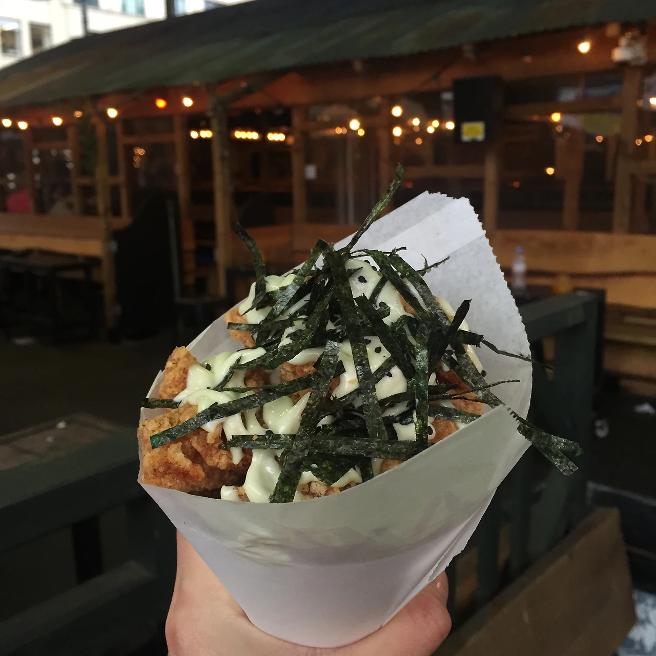 가려던 올프레스 라는 곳은 문을 닫았다. 근처에 작은 포장마차들이 모인 곳에 갔다. 슬슬 허리가 한계가 왔다. 가장 잘되는 곳을 보니 치킨집이다. 와사비마요를 먹었다. 거기만 유독 잘 된다. 다른 5-6곳엔 사람이 별로 없고 이르헨티나, 브라질 쪽은 아예 없다. 조명이나 씨씨티비 설치 등 프랜차이즈를 해본 사람들 같다. 홍콩 쪽? 맛있다. 와사비와 마요네즈와 치킨이라니. 어쩌다 들어온 곳에서 맛난 걸 먹다니. 가고픈 곳들이 문을 닫은 게 도리어 좋게 연결된다. 먹고 나와서 근처 슈퍼에서 마실 것을 사러 갔다. 카드만 된다. 진저비어 마셔보려는데 아쉽다.