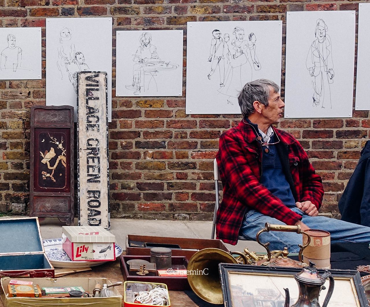 런던 노팅힐 마켓을 쭉 걷다 보면 벽에 그림이 걸린 골목을 지나게 된다. 느낌 있는 그림을 그린 작가는 누구일까 궁금했다. 내 마음대로 그 앞에 있는 사람들 중 한 명이라 추측해봤다. 각자 파는 물건을 보고 성격을 상상해보기도 한다.
