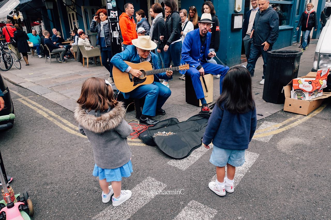 런던 노팅힐 포토벨로 마켓을 들렀을 때 가장 인상 깊었던 장면. (아마도) 색소포니스트의 연주를 지켜보는 중이었다. 연주는 지나가던 우리를 멈출만큼 매혹적이었고 흔들거릴만큼 리듬감 있었다. 한창 듣는 중에 흥에 취한 여성 분이 춤을 추기 시작했다. 눈에 확 들어오는 호피 무늬 외투를 걸친 채 귀에 확 들어오는 재즈 음악에 몸을 맡겼다.