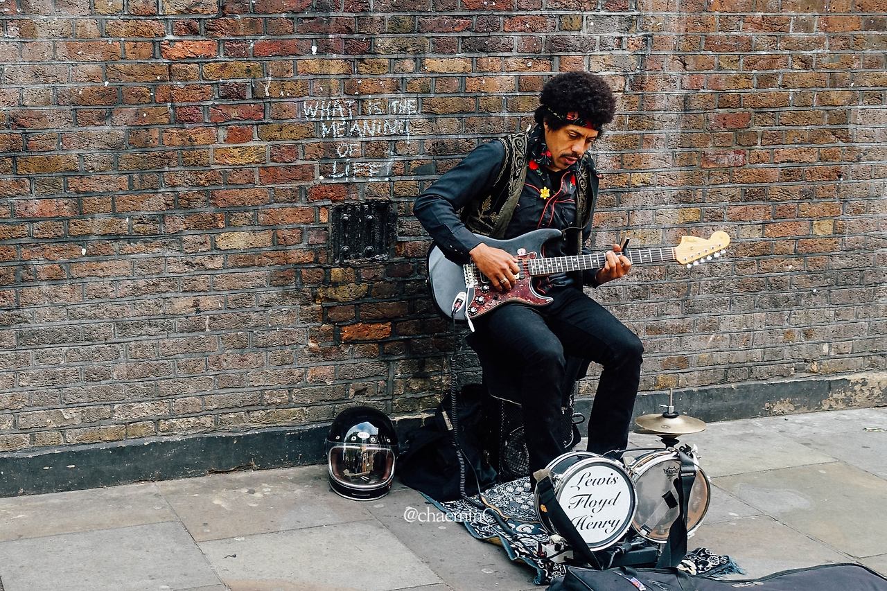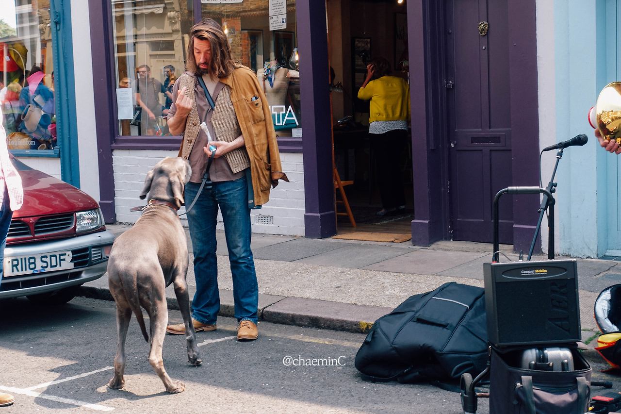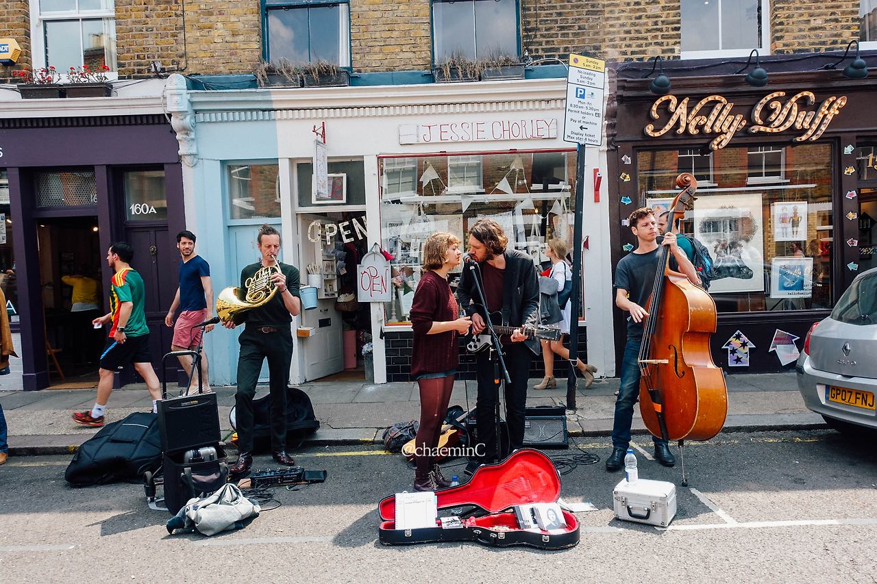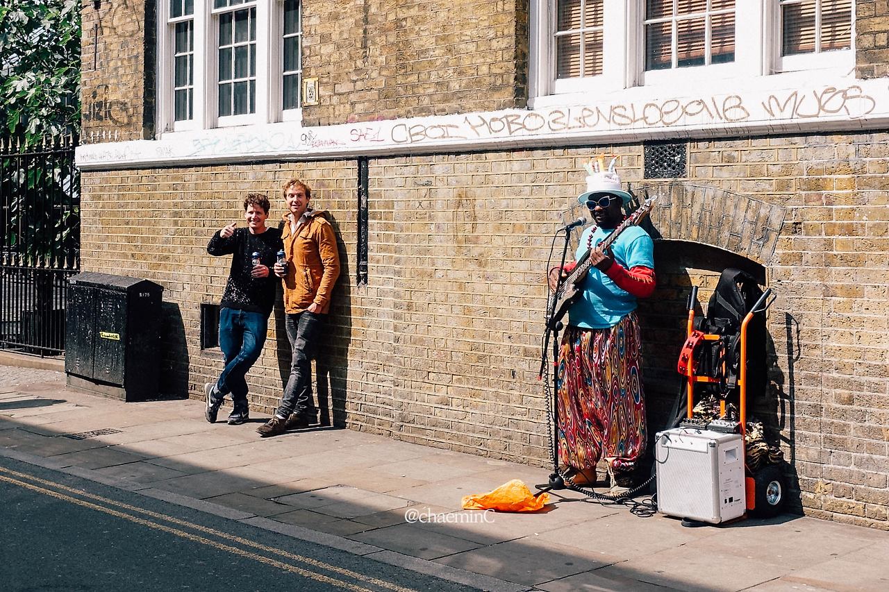 런던 플라워마켓 가는 길에 만난 버스커. 아직 연주하기 전에 튜닝하는 중이었다. 얼핏 봐도 뮤지션이란 느낌이 물씬 든다. 가는 길에 본 거라 연주를 듣진 못 했다. 다시 사진을 정리하며 새롭게 보게 된 게 있다