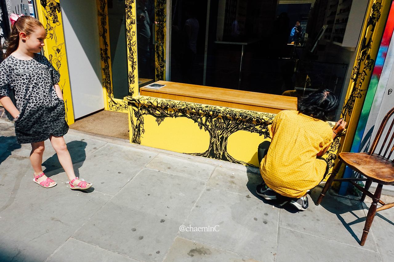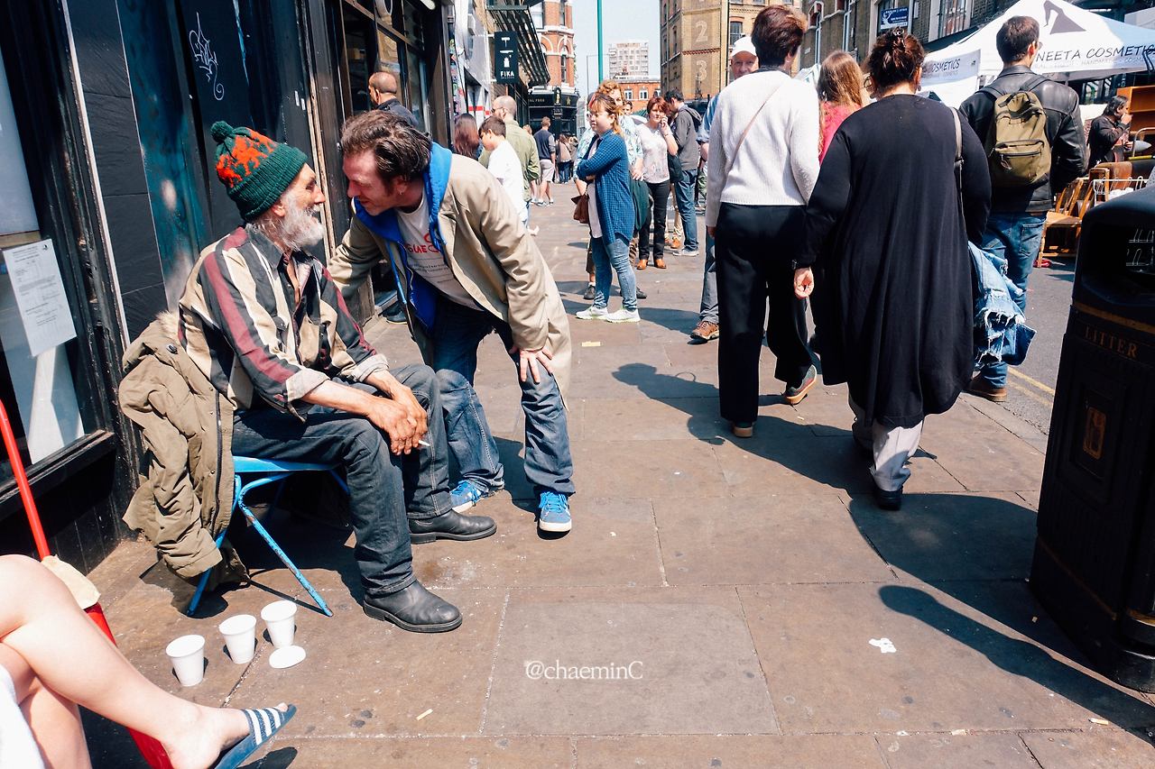 런던 플라워마켓에 가면 체감상 광화문 광장보다 조금 긴 거리에 꽃과 사람이 가득했다. 꽃반 사람반이라 해도 틀리진 않겠다. 길고 긴 꽃의 터널을 지나 가끔 숨통을 트는 길이 나오는데 거기에서 재밌는 장면을 봤다.