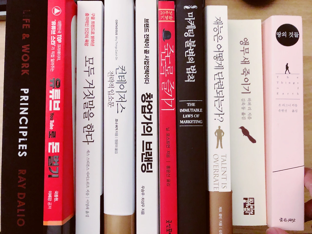 조금씩 흘린 시간을 모으니 한 움큼이 됐다. 원래는 사진으로 찍어둔 저 10권을 읽고 싶었다. 한 주를 보냈을 땐 6권을 읽었다. 양으로 따지면 맨 왼쪽 책, 레이 달리오의 <원칙>이 평범한 단행본 3권 분량이라 9권 정도 읽었다고 봐도 될 것이다.