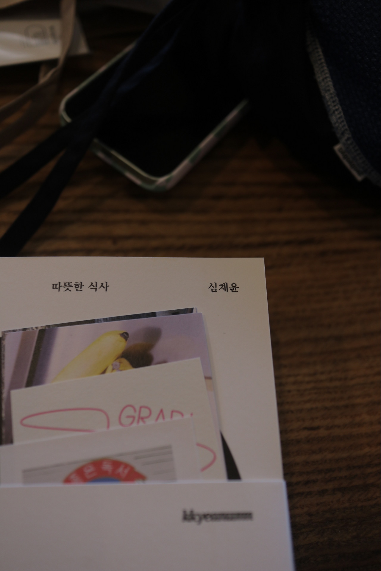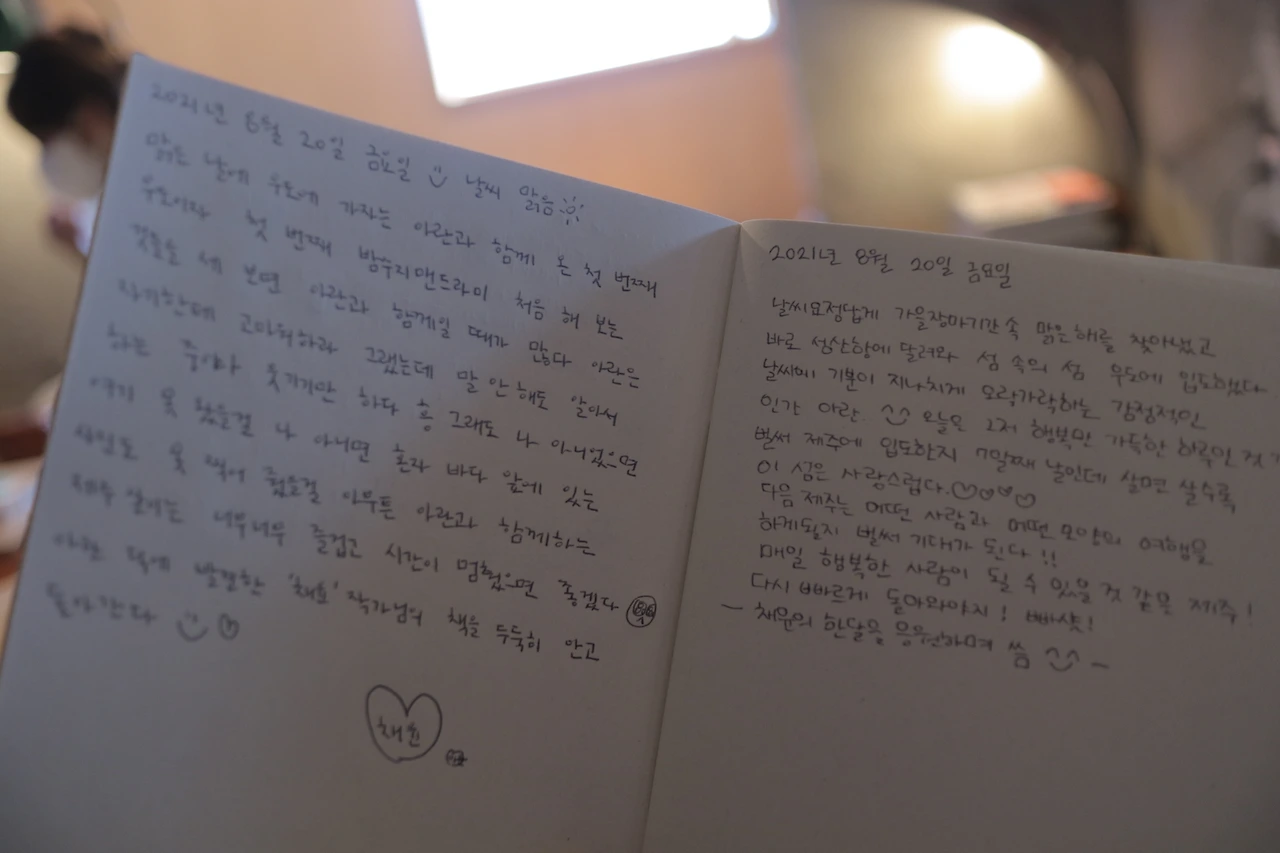 아란은 매대 위에서 내 이름과 같은 작가님의 유기농 밥상 요리책을 발견하곤 채윤, 하고 불렀다. 발품 팔아 알게 된 농부님들의 농작물 정보와 연락처, 그리고 주고받았던 메시지까지 첨부되어 있던 책이었다. 몰랐던 세계를 하나 더 알게 된 기분이었다. 같은 이름을 가진 멋진 사람의 책 한 묶음, 그리고 옆에 놓여 있던 초보 비건의 책 한 권, 아란에게 적어 줄 엽서 한 장과 모든 그림들에 이유가 있던 엽서집까지 바리바리 챙긴 뒤 결제했다. 찍어 주시는 도장이 예뻐서 아란에게 자랑했다. 아란은 내가 책을 고를 동안 잠시 바다를 보고 다시 돌아왔고, 우리는 차 한 잔과 커피 한 잔을 시켰다. 가만히 앉아 있다 한쪽에 놓인 방명록을 발견했다. '아란'이 세 번이나 들어가는 짧은 글을 적어 낸 뒤 아란에게 전달했고, 아란은 웃으면서 쓰고 싶은 말을 썼다.