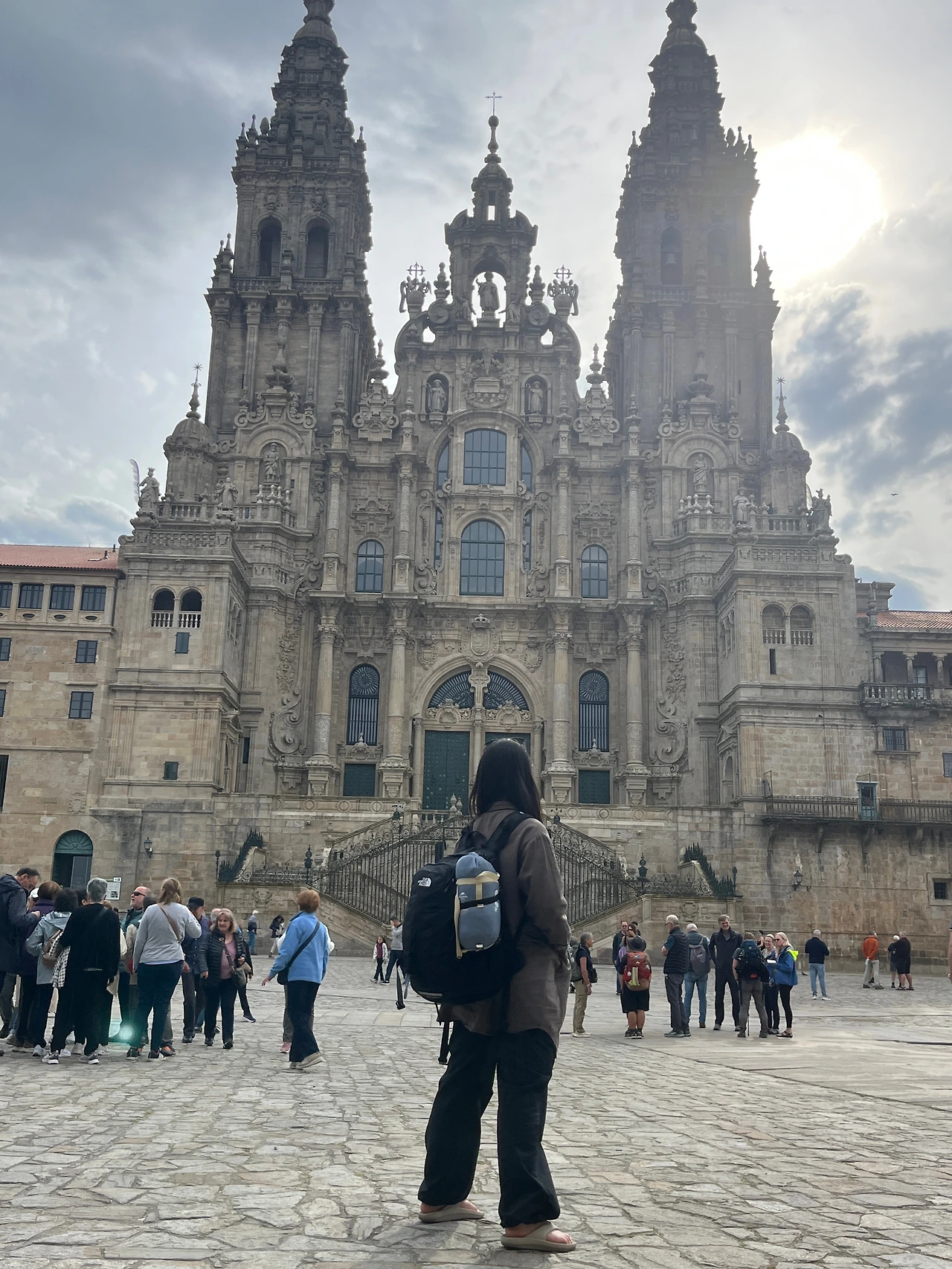 정작 버스에서 내리니 설레는 마음은 이미 서서히 사그라들기 시작했다. 산티아고 대성당 앞 광장에 다다랐을 때는 평온하리만큼 덤덤했다. 사실 이미 예상했던 바였다. 2년 전 프랑스길을 걸을 때, 순례길을 완주하고 성당 앞에 서면 눈물콧물 쏟으며 기쁨과 성취감에 취해있을 줄 알았는데 전혀 그렇지 않았기 때문이다. 나는 그때도 생각보다 덤덤했다. 이는 모든 순례자들이 순례길을 마치며 공통적으로 깨닫는 것이기도 하다. 길은 끝나지 않는다는 것. 분명 한 번 깨달았던 사실인데 어쩌면 나는 그걸 바보처럼 또 잊어버린 채, 몸소 다시 깨닫고 싶어 이 길에 오른 것일지 모르겠다. 성당 앞에는 저마다의 방식으로 완주의 순간을 맞이하는 이들이 있었다. 서로를 부둥켜안고 기쁨을 나누는 사람들, 영상과 사진으로 그 순간을 기록하는 사람들, 기둥에 기대어 조용히 휴식을 취하는 사람들. 그 가운데 나는 샌프란시스코에서 날아온 '내일부터 순례자'였고.