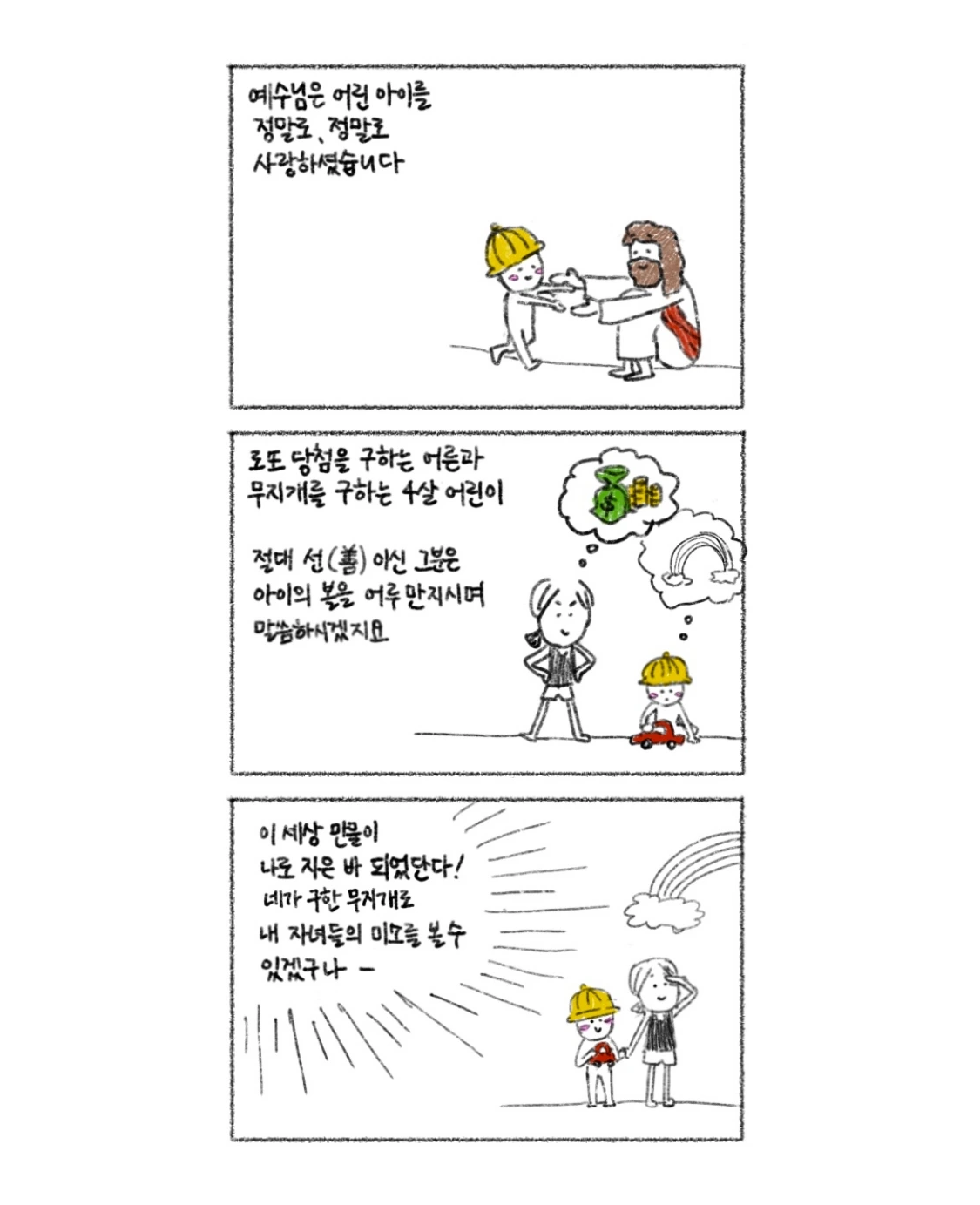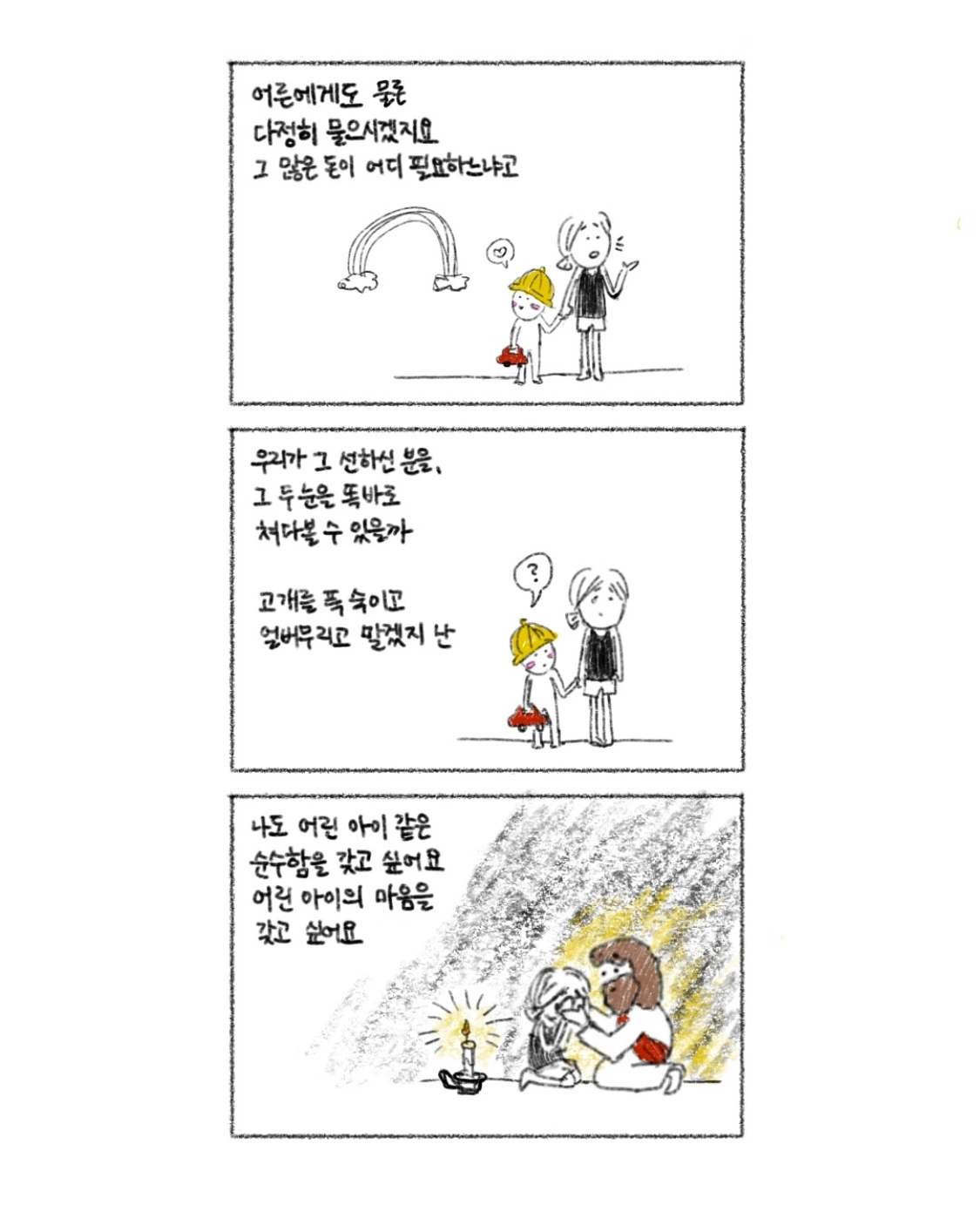 우리가 항상 잊지 말아야 할 것은, 하나님은 선(善)이시라는 것. 그리고 또 하나, 어린아이가 구하는 것과 어른이 구하는 건 씁쓸하게도 참 많이 다르다는 것