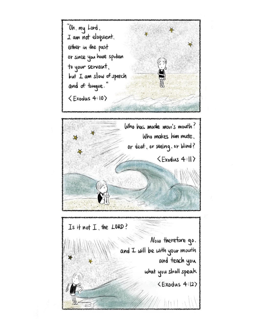 모세가 여호와께 아뢰되 오 주여 나는 본래 말을 잘하지 못하는 자니이다주께서 주의 종에게 명령하신 후에도 역시 그러하니나는 입이 뻣뻣하고 혀가 둔한 자니이다여호와께서 그에게 이르시되누가 사람의 입을 지었느냐누가 말 못하는 자나못 듣는 자나 눈 밝은 자나 맹인이 되게 하였느냐나 여호와가 아니냐이제 가라 내가 네 입과 함께 있어서 할 말을 가르치리라 <출애굽기 4:10-12>