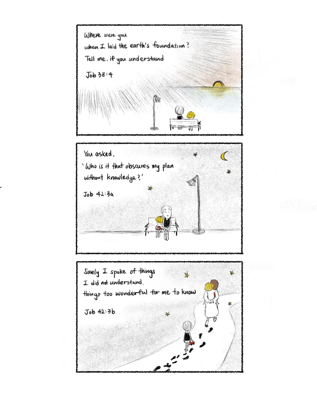 주께서는 물으시길 ‘알지도 못하면서 내 뜻을 흐리는 자가 누구냐?’ 하셨습니다. 바로 제가 잘 알지도 못하면서 함부로 입을 놀렸습니다. 너무나 경이롭고 기이해서 저로서는 도무지 알 수 없는 일들에 대해 떠들어댔습니다.욥기 42:3 (쉬운성경)