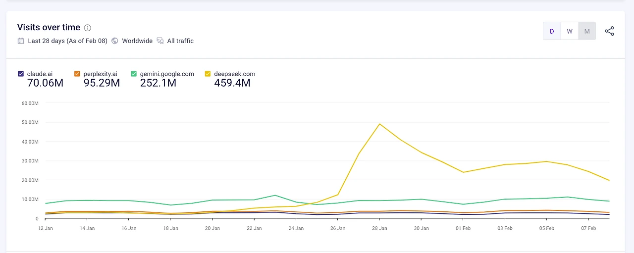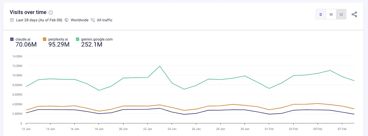 일단 (잠재적) 경쟁자들부터.. 지난 28일간 daily usage. 그런데... 생각보다 gemini 가 이렇게 잘 하고 있다고..?