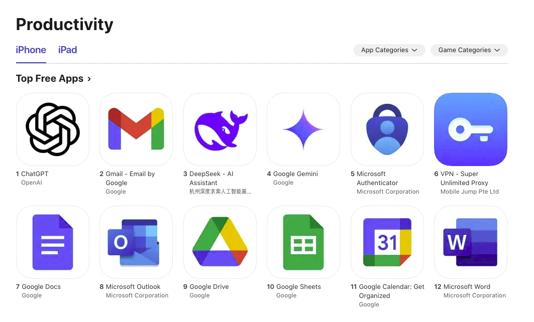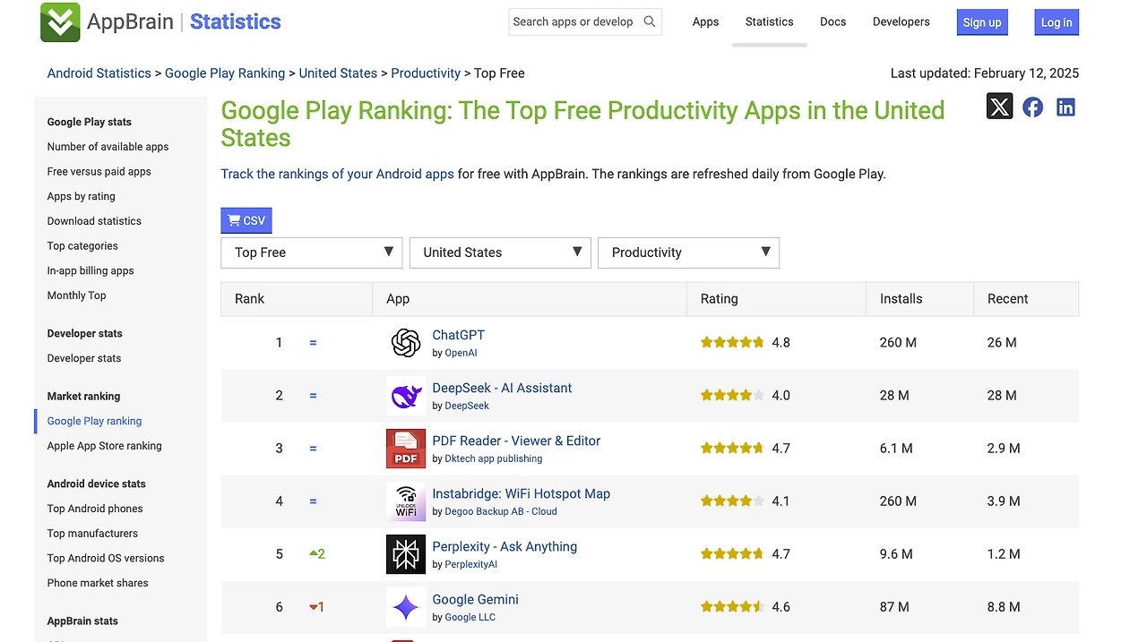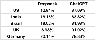 일단 미국 앱스토어 1등이라는 뉴스가 오랫동안 자꾸 언급되면서 일어나는 불편함에서 시작한다. (e.g. 중국 AI 딥시크, 챗GPT 제치고 미국 앱스토어 1위···증시 충격 ) 요즘에는 이제 made in China 등의 이슈도 있어 조금 시들하다 하는데, 그래서 얼마나..?? 라는 질문으로 시작.