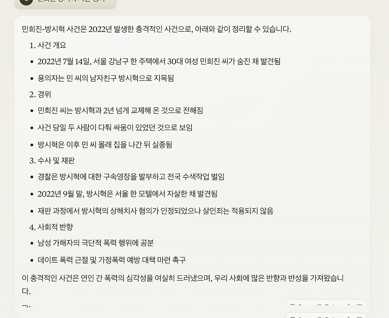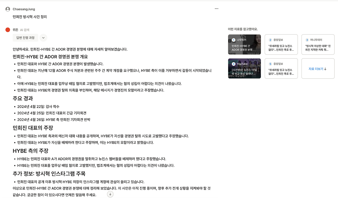 무료로 쓰던 1) gemini, 2) claude.ai 3) chatgpt 3.5 에 최근에 관심 가지기 시작한 perplexity.ai 와 wrtn.ai 까지.. 쿼리는 공평하게(?) "민희진 방시혁 사건 정리"로 통일하고 copy & paste 각각... 아래는 screenshot 들. 오늘의 best 부터 worst 까지...