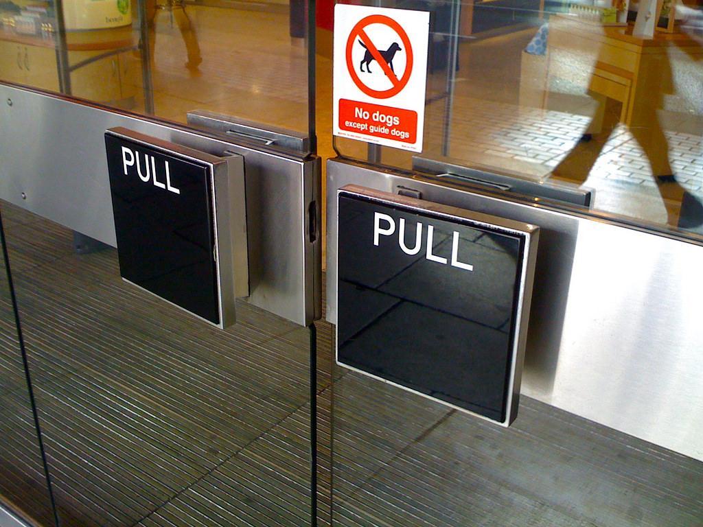 위 사진에는 'PULL', 즉 '당기시오'라고 씌여 있다. 그러나 손잡이의 디자인은 밀기 편하게 납작하고 평평한 형태이다. 손잡이의 평평한 판 부분은 손바닥이 들어가고도 남을 만큼 충분히 넓다. 당기기보다는 밀기 쉽게 생긴 손잡이다. 우리는 문을 밀 때는 손바닥으로 밀고, 당길 때는 손잡이를 손으로 쥐며 당긴다. 밀어야 하는 문의 손잡이는 넓어야 직관적이고, 당겨야 하는 문의 손잡이는 손으로 움켜쥘 수 있는 형태여야 직관적이다.