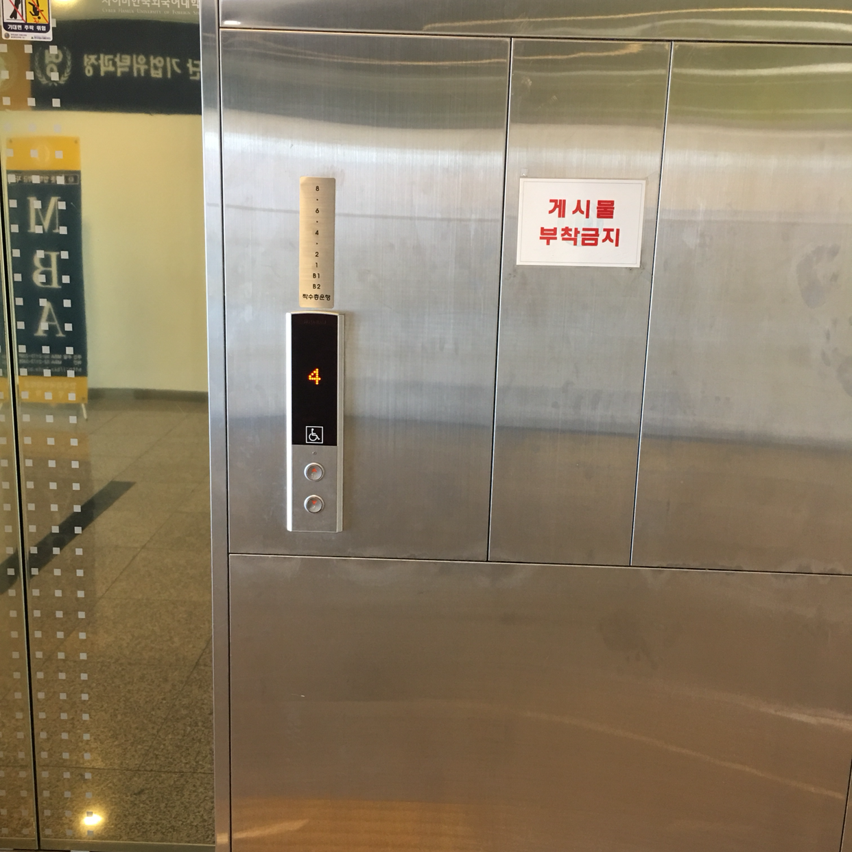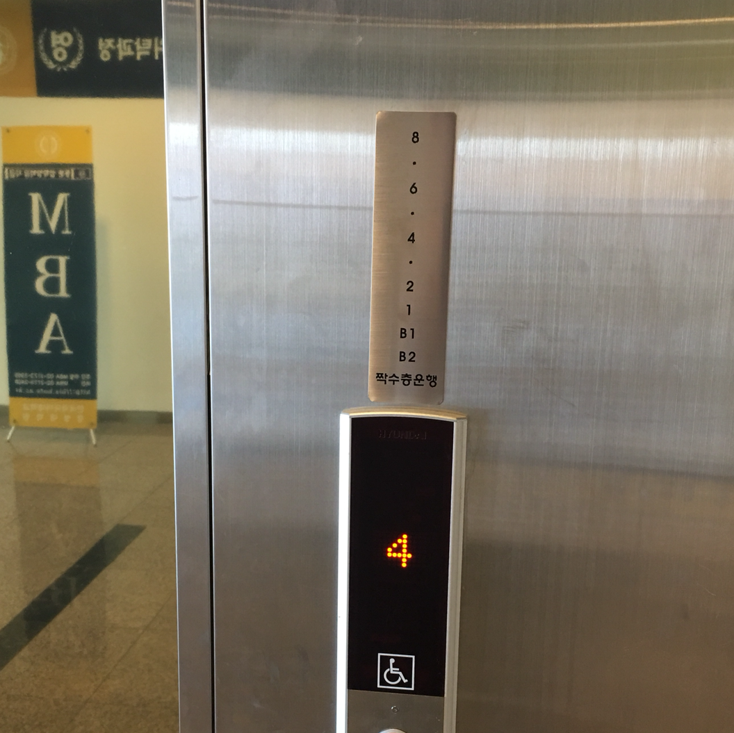 한국외국어대학교 사이버관에서 찍은 엘리베이터 사진들이다. 이 건물에는 총 세 대의 엘리베이터가 있다. 하나는 홀수층, 하나는 짝수층, 나머지 하나는 전층 운행을 한다.