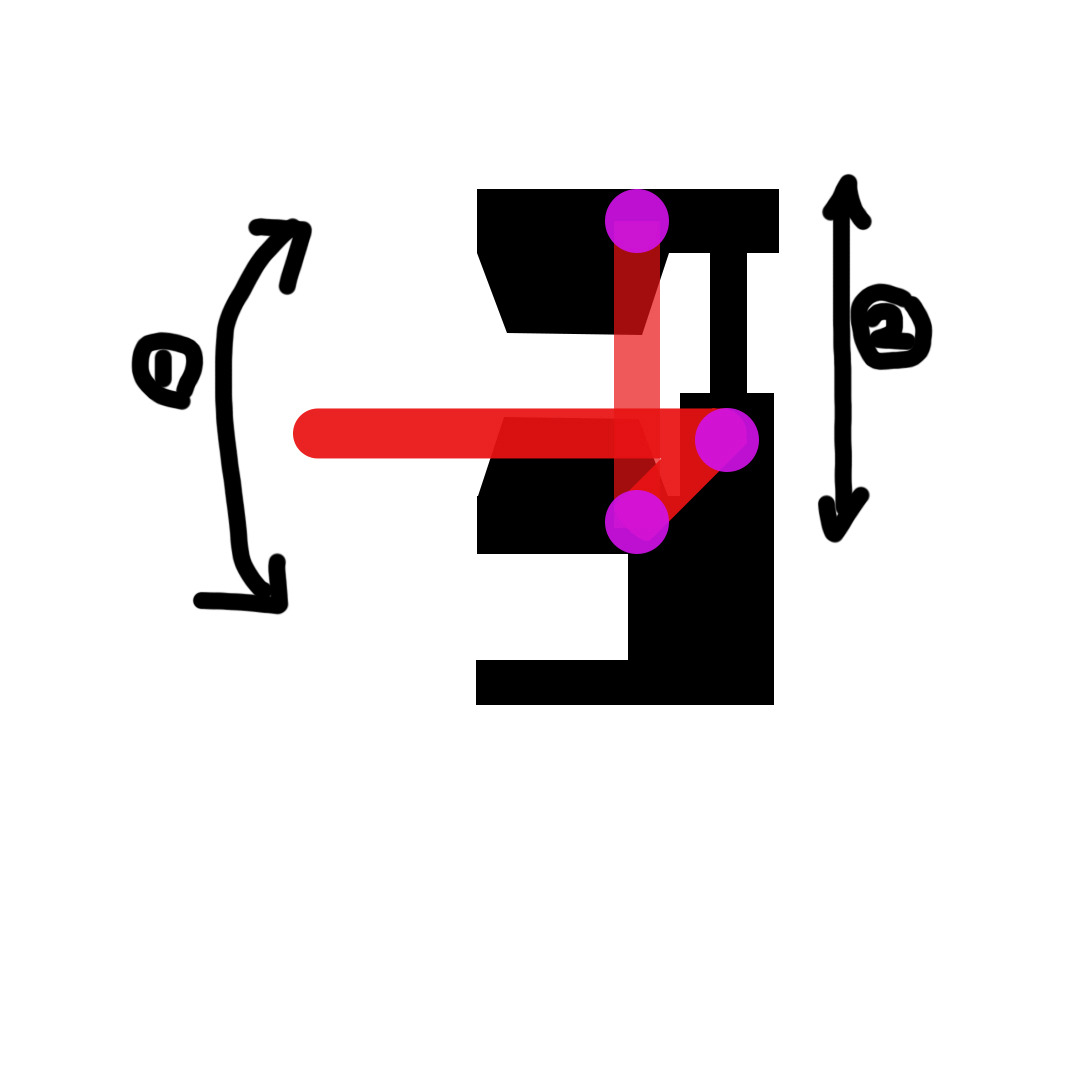 다음으로 오렌지 X의 평면도를 살펴보자. 빨간색은 레버 부분이며 검은색은 제품 본체, 자주색은 고정 핀이다. 레버는 자주색 고정핀을 통해 제품 본체의 지지대와 착즙기의 윗부분에 결합된다. 1번 화살표처럼 레버를 위에서 아래로 내리면 2번 화살표에서처럼 착즙기의 천장이 위에서 아래로, 수직으로 움직인다.