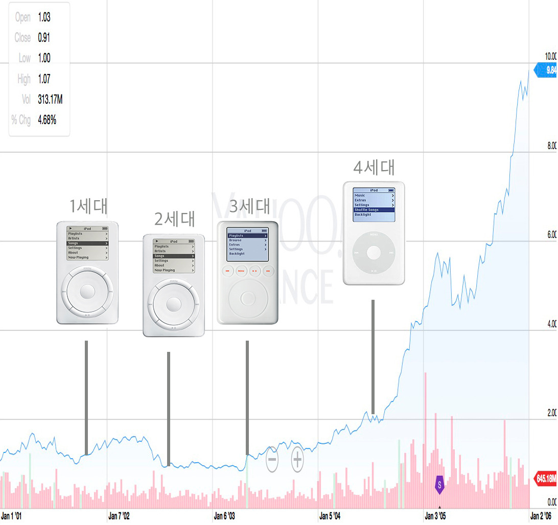 애플의 주가 역시 3세대 출시와 맞물려 본격적으로 상승하기 시작하였으며, 4세대 출시 이후 기록적으로 증가한 것을 확인할 수 있다. 물론 애플이 아이팟이라는 단일 제품만을 판매하는 회사는 아니며, 주가에 영향을 주는 요인도 제품 판매 외에 다양하다. 그러나 아이팟의 히트와 애플 주가가 맞물려 있을 수 있다는 개연성 만으로도 여기에 필요한 충분한 인사이트가 되므로 조금은 무리하게 주가와 아이팟 세대를 연결지어 보았다.