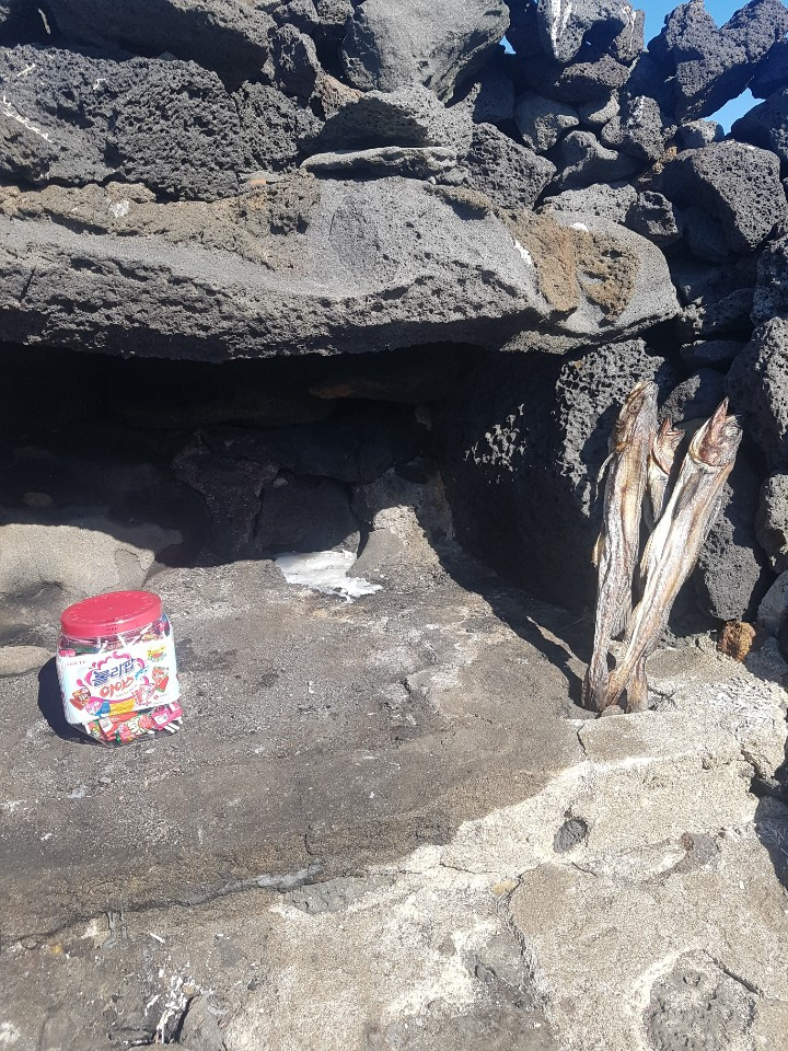 마라도 해녀의 물질을 돌보는 신을 모신다는 할망당, 혹은 아기업개당이라 불리는 돌무더기에 사탕이나 북어포 따위가 조심히 놓여있다. 아기를 업고 죽은 여자애의 넋을 달래는 사람의 애정과 물질하는 해녀의 안녕을 기원하는 마음이 수수하다.