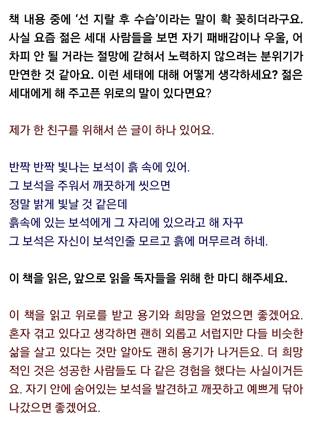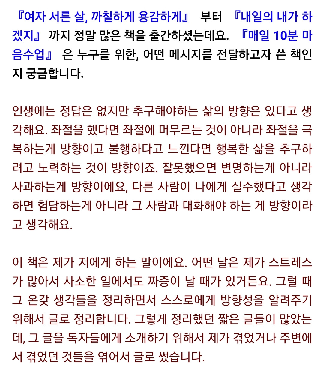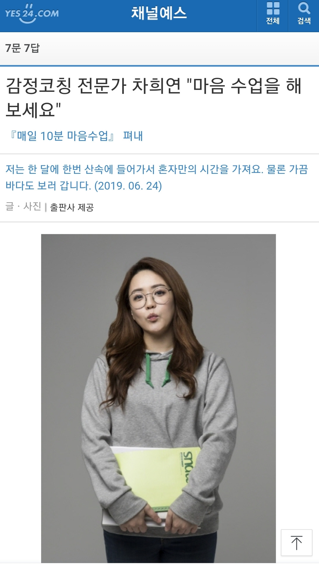 채널 예스 24에 인터뷰 내용이 실려서 가져왔어요.#매안10분마음수업 관련 인터뷰에요.책이 나오게 된 배경같은 인터뷰에요~#차희연 #차희연작가 #신간 #매일10분마음수업 채널예스 바로가기 : http://me2.do/5WgsOA7o
