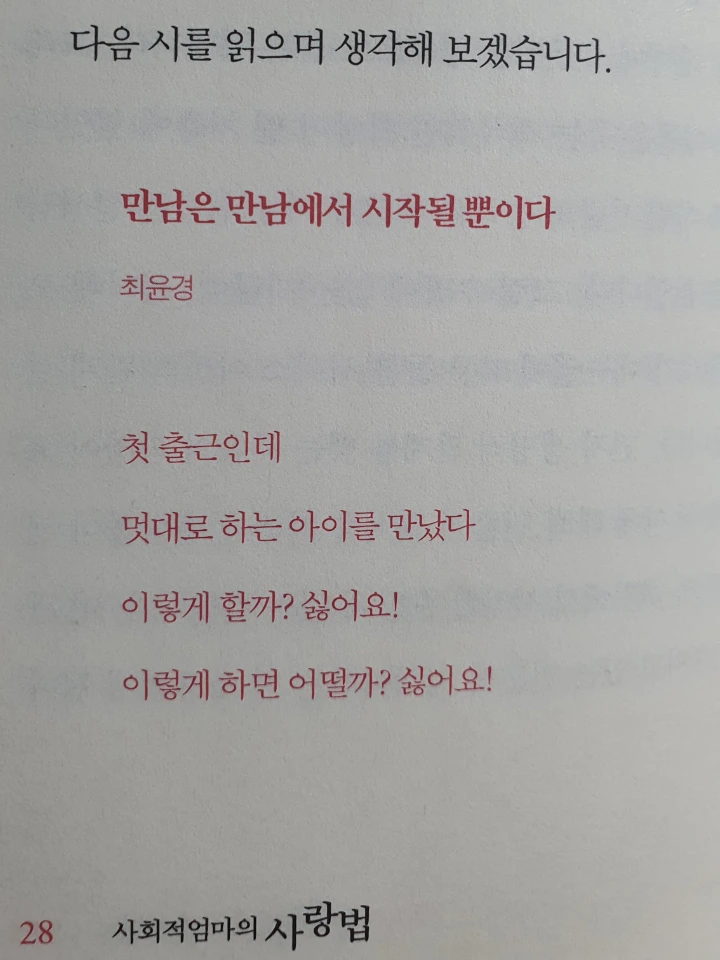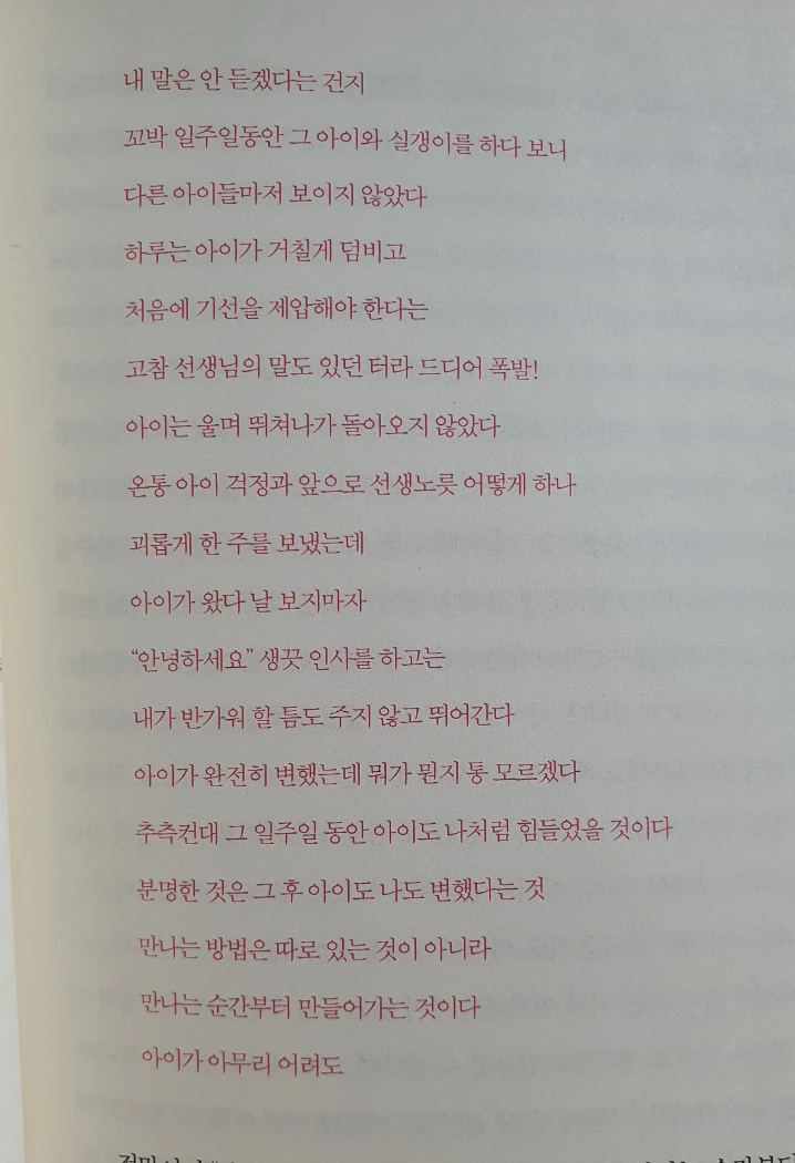 이 아이들을 그저 품어줘야 한다는데 아직 그 경지에 이르지는 못했지만 조용한 위로와 함께 마음가짐을 새로이 하게 되었다. 평화로 가는 길은 없다, 평화가 곧 길이다.라는 말처럼 아이들을 대하는 방법이 따로 있는 게 아니란 생각을 해본다.