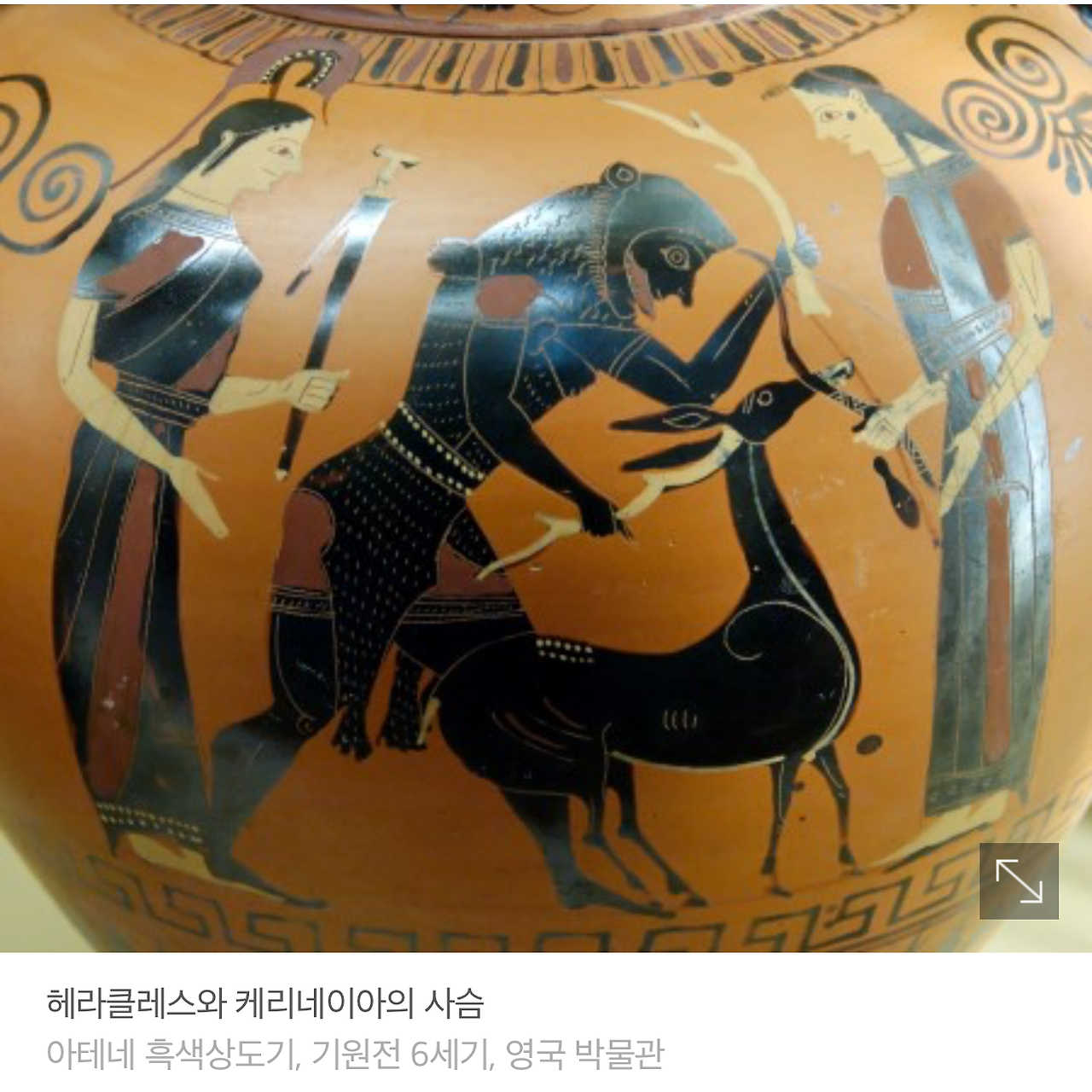 저는 일년 동안 도망다니다가 지금에서야 귀환했어요. 일년 동안 내내 저를 잡으려고 하는 헤라클레스에게 쫓겨 달렸죠. 집요하게 저를 추적하는 헤라클레스는 자신의 저주를 풀기위해 저를 잡아오라는 명을 수행한 거죠. 제가 그 대상인 것은 아르테미스가 가장 아끼는 사슴이어서 그랬을 거예요. 헤라클레스를 궁지에 빠지게 하려는 거죠. 저는 결국 지쳐서 잡혔어요. 무릎을 꿇었죠. 다행히 헤라클레스는 제 털끝하나도 손상시키지 않았어요. 아르테미스에게 약속했다더군요. 다시 온전한 모습으로 돌려주겠다고요. 오늘 겨우 귀환됐어요. 헤라클레스는 과업을 하나 완성했다더군요. 그에게 씐 저주를 풀기 위해 누구에게도 잡히지 않을 재빠른 저를 일년을 쫓아다녔으니 저도 탄복합니다.