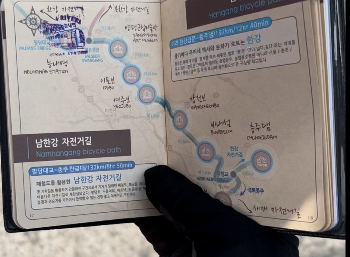 스탬프 다 찍으려면 평생 걸리지 않을까 싶었다. 그런데 종주수첩 몇 군데에 스탬프를 찍으면서 재미가 붙었다. 또 자전거 길에 대한 감각과 길을 달리는 여유가 생기다보니, 심심할 때 종주수첩을 뒤적거리면서 다음에는 어느 길을 달려볼까 호기심이 생겼다. 구매당시와는 달라진 마음에 나도 살짝 놀란다. 자전거 여행 콧바람이 들면 그것을 부추겨(!)주고, 미리 다녀와본 검증된 경험자들의 정보가 있는, 안정적인 자료를 제공해주는 종주길 말이다.