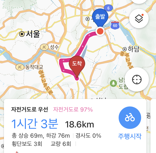 낑낑거리며 오른 언덕의 끝에는 한강 자전거길이 바로 앞에 흐르고 있었다. 양편으로 왔다갔다 하는 자전거 사이를 끼어들기 해야하므로 심호흡을 해야했다. 지도앱에서 어드메쯤인지 확인하였다.