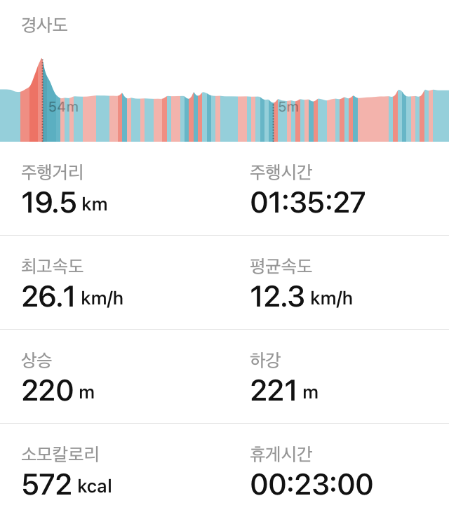 주행시간은 1시간 35분, 그러나 초반 15분 포함하면 1시간 50분 걸렸다. 한강자전거길에서 탄천쪽으로 가다가 헤매고, 틴찬길에서 기차역으로 나가는 길을 칮느라 헤매었다.