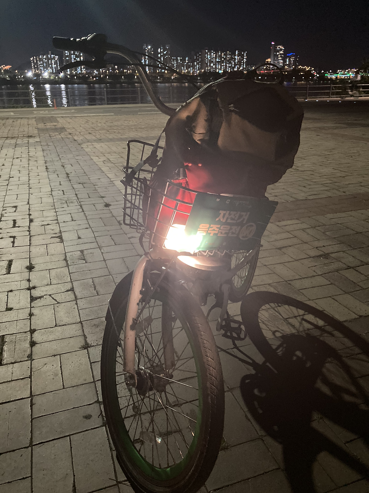 따릉이가 도심형이라 내게 적당한 낮은 안장과 바구니가 달려 있고, 변속기어도 3단이나 되는 것이 좋았다. 나는 저녁 7시쯤 출발할 거라는 예상을 하여 집에서 전조등과 후미등을 챙겨나왔다. 전조등은 캠핑 때 쓰는 크레모아 미니, 후미등은 헬맷에 부착된 것으로.