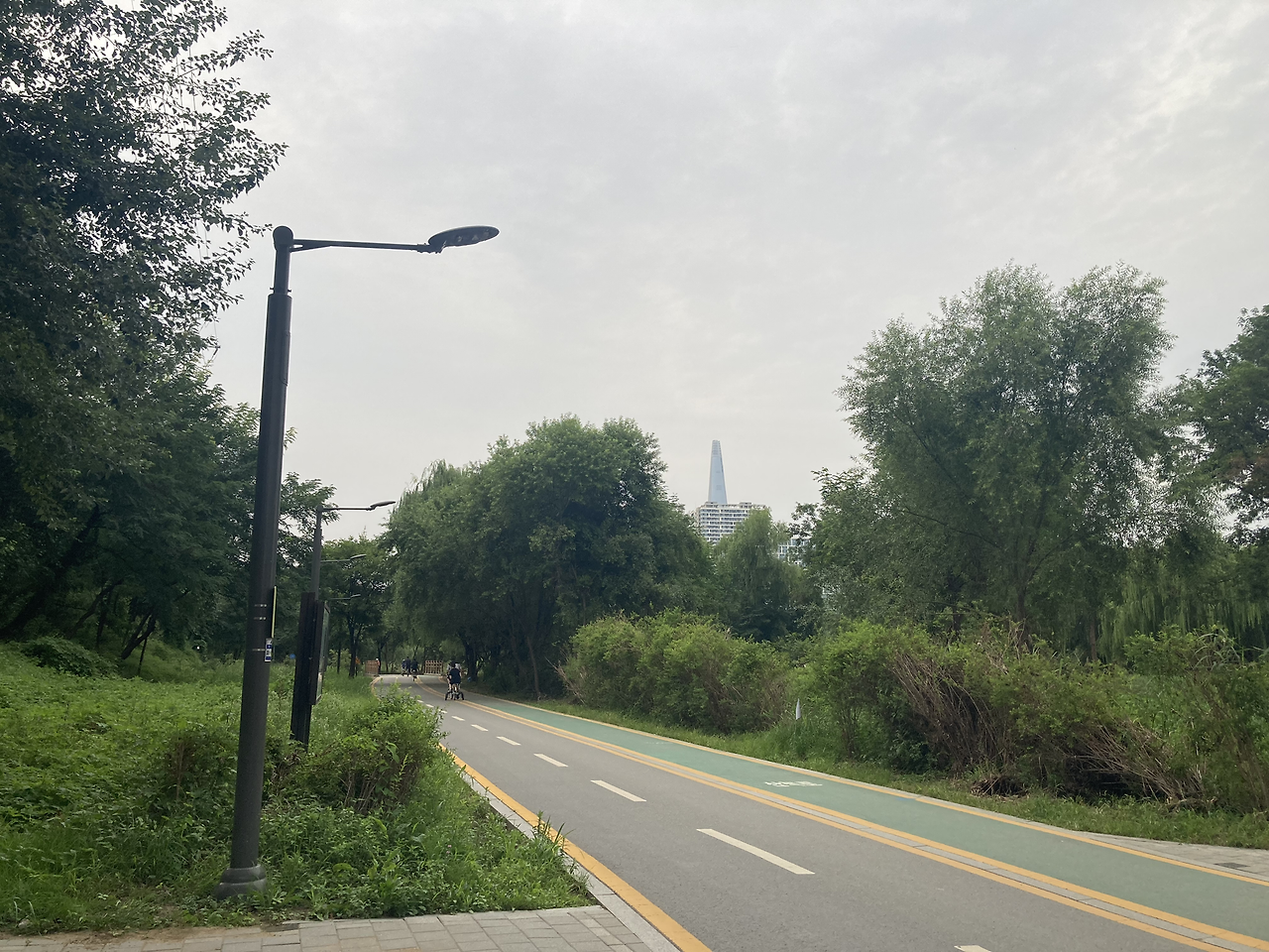 잠실에서 탄천 들어가기 직전까지 유람선 선착장도 있는 그곳에 사람들이 가장 많이 있었다. 넓게 펼쳐진 잔디밭에서 사람들이 쉬는 모습을 볼 여유는 없었지만, 전방 주시와 빠른 페달링 때문에, 공기로 곁눈으로 보는 풍경에서 사람들의 수를 짐작하였다. 정말 많은 사람들이 있었다. 자전거 행렬도 가장 길었다. 사람들이 따릉이, 혹은 자신의 자전거를, 또 모임 사람들인냥 속도를 맞춰 가는 사람들이 많아서 처음으로 자전거 도로가 한동안 정체되었다. 페달을 밟지 못하고, 천천히 주행하였다. 그리고 탄천에 들어섰을 때 반포 쪽으로 가는 사람들과 수서, 성남쪽으로 가는 길이 나뉜다. 여기서 사람들이 많이 갈라져서 자전거 수가 줄어들어 길이 여유가 있었다. 수서쪽으로 향하면서 자전거 길은 좁아지지만 길에 늘어선 가로수들은 더 우거지고 멋있었다. 갓길이 아닌, 졸음쉼터처럼 공터가 나오면 쉴 수 있는데, 초행길이다보니, 번번이 쉴 곳을 놓쳤다. 후진할 수 없어서 그냥 전진을 하며 겨우 멈춰선 곳이 여기였다.