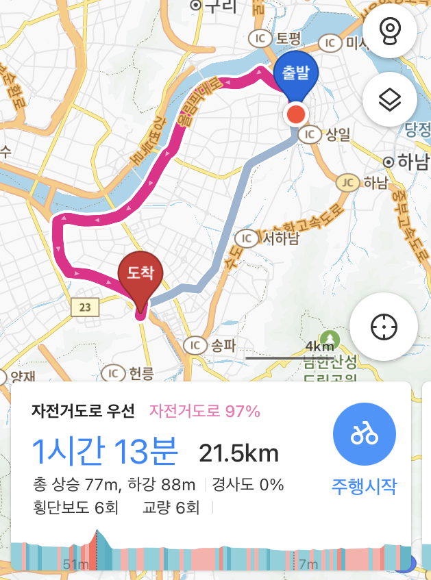 앱을 켜서 자전거 길찾기 검색을 했다.
