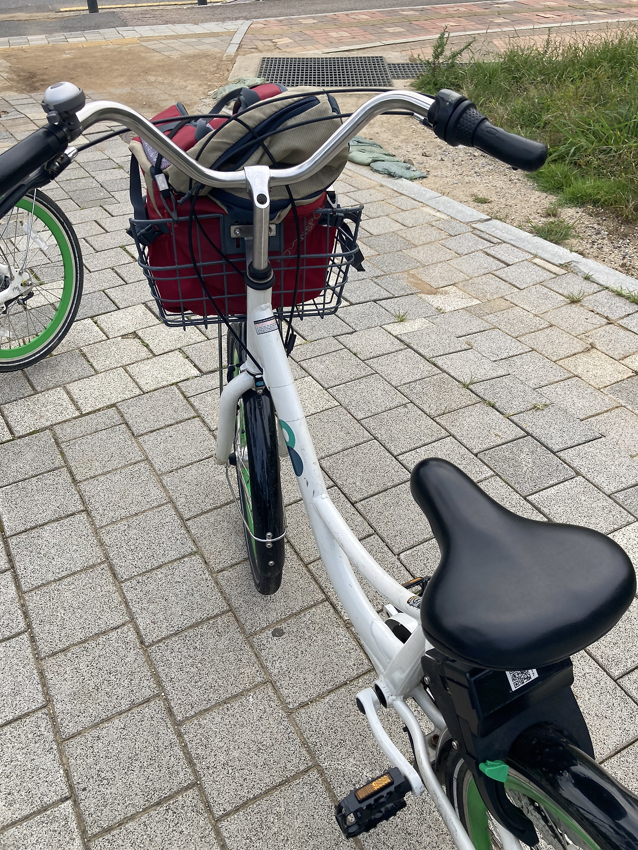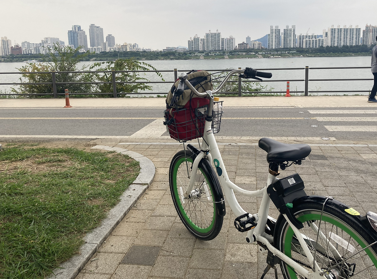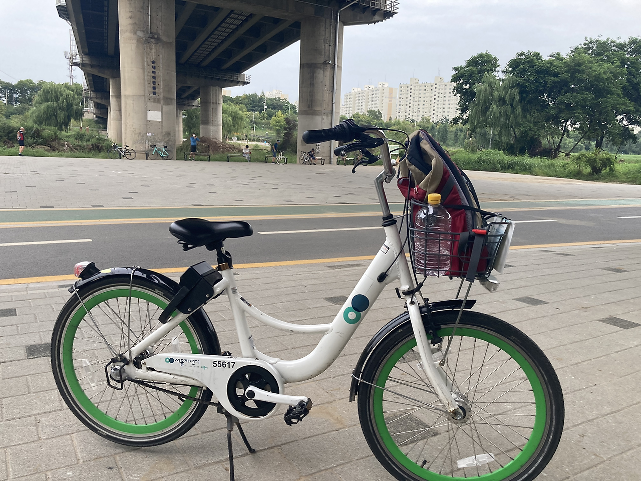 오늘 빌릴 자전거는 바퀴가 튼튼해 보이는 따릉이였다. 따릉이에 바구니 달려 있는 것은 정말 장점이다. 이렇게 무거운 가방을 등에 메지 않고, 바구니에 올려놓고 탈 수 있다. 물론 횡단보도 신호에 멈춰섰을 때는 자전거 바구니의 무게로 인해 핸들이 약간 틀어지는데, 따릉이는 세웠을 때 버팀대가 아주 튼튼하게 달려 있다. 따릉이는 뒷바퀴가 살짝 들어올려지도록 버팀대가 중심을 잘 잡아준다. 단, 처음 해보는 사람들은 다시 버팀대를 뒤로 넣고 출발하는 데 애를 먹을 정도로 아주 강력하다. 요령을 안다면 금방 적응된다.