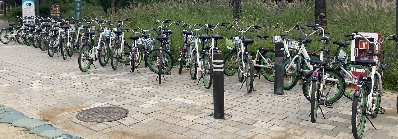 곧이 곧대로 믿지 않고 내 페이스대로 해보려고 한다. 우선 따릉이 대여소에 갔다. 평상시에는 5-6대밖에 없는데 오늘은 꽤 많은 사람들이 이 곳에 반납을 하고 갔나보다. 정말 많은 후보군이 있었다. 바퀴가 너무 닳지는 않았는지, 브레이크는 내 손에 맞게 부드러운지, 빡빡하진 않은지 점검도 해본다. 그리고 안장 높이가 얼핏 맞아 보이는 따릉이를 골랐다. 수많은 사람들이 탄 자전거 중에 어떤 따릉이는 뒷바퀴 물받이부분이 망치로 때린 듯 아주 구김이 많았다. 누군가가 탔다가 넘어져서 생긴 흔적은 아닌지 다치진 않았는지, 자전거에 새겨진 흔적들이 함께 공유하는 사람들의 경험까지 가 닿는데, 낯설지 않다.