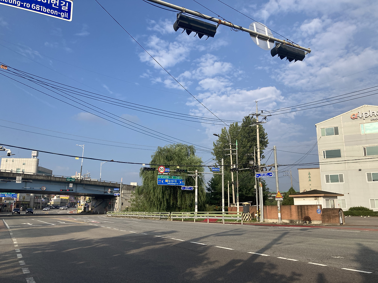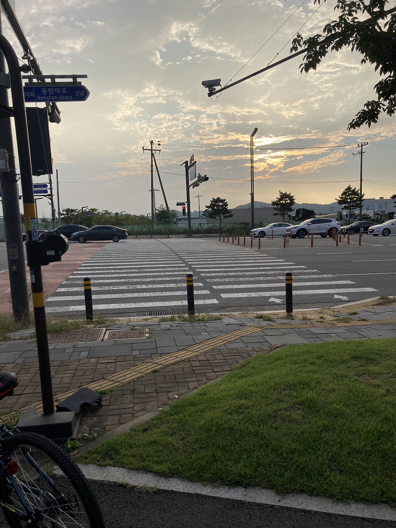 꽤 많은 횡단보도와 보행자 신호가 들어오기까지 꽤 오래 걸렸다. 인도에 보행자와 자전거를 분리하여 도로가 나 있는 신도시의 길을 따라 쌩 하고 달리지만 몇 분 되지도 않아서, 아니 몇 백미터 되지 않아, 곧 신호를 기다리는 시간이 찾아온다. 그렇게 도심에서 구르다가 멈추다를 반복하다보니 논스톱으로 페달을 계속 밟고 싶다는 마음을 느꼈다. 뭔가 찔끔찔끔 달리고 마는 것이 아쉬웠다. 자전거를 타고서 기흥호수 공원이라는 목적지를 정해서 이동하고 있었지만, 가는 길의 안전함과 편안함, 달리고 싶은 마음을 충족시키는 뭔가를 찾게 되었다. 첫번째로 가는 길의 달리고 싶은 마음 충족은 어려웠다. 걷는 사람과 내가 같이 출발하여 횡단보도에 내가 먼저 도착해 있었는데, 그 뒤로 걷는 사람이 내 옆에 와서 서있는다. 그만큼 신호를 기다리는 시간이 긴 편이다. 자전거를 타고 있는 목적이 ‘달려보고 싶었음.’이었기에 자주 멈추는 것은 아쉬웠다.