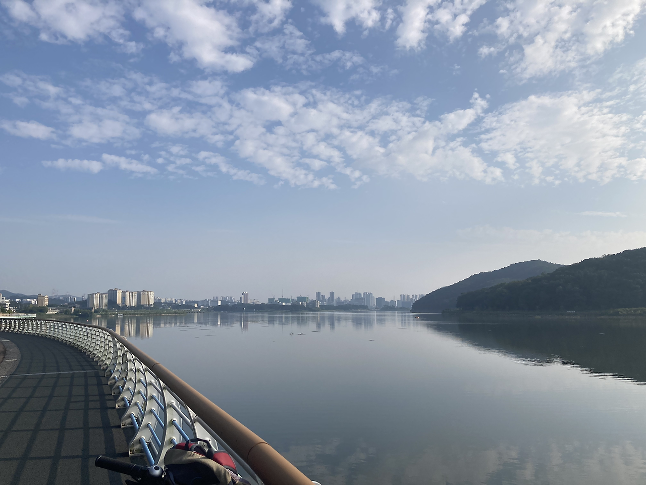 어렵사리 자전거를 타고 때론 끌기도 하면서, 호수에 도착했을 때의 감정은 “드디어 왔구나.” 였다. 제일 먼저 물을 꺼내 벌컥벌컥 마셨다. 길에서 긴장하여 자전거를 세우지도 못하고 마시지 못했던 물통을 꺼낼 때의 그 안심되는 마음. 목을 축였으니 호수를 에둘러서 만들어진 자전거 도로를 따라 신호등 없이 씬나게! 달려볼 생각이 들어 들떴다. 아직도 다리에 힘이 좀 있다. 달려볼까.