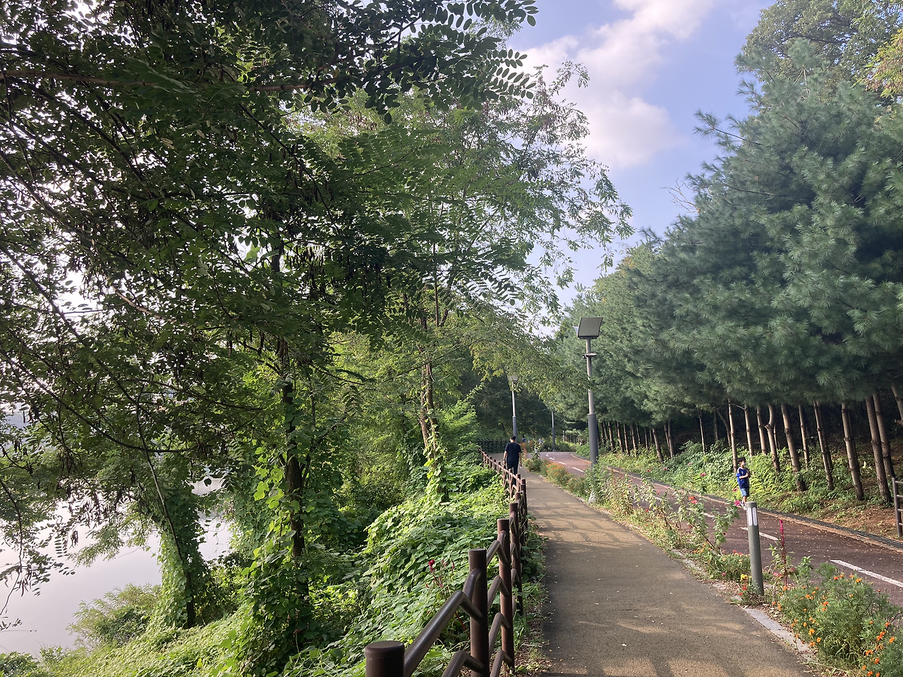 주행 중 맨처음 호수를 보았을 때를 사진으로 기록하고 싶지만 그러진 못했다. 워낙 좁아서 자전거를 멈춰세우면 누군가가 뒤에서 지나갈 수가 없기 때문이다. 눈으로 그 느낌을 가득담았다. 호수는 있는데, 진입로를 찾으려고 애쓰고, 촉으로 내리막으로 향하면서 기흥 호수 공원의 자전거 도로에 진입했다. 여기까지 오는 후반부는 모든 길이 안전하고 편안한 길은 아니었지만, 아름답고 울창한 호수의 숲에 들어온 것이 좋았다.